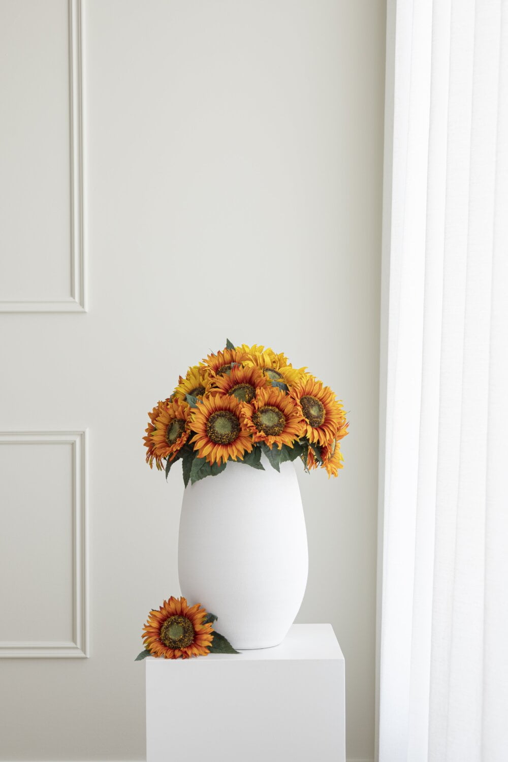 Artificial orange sunflower. Use this classic fall blossom in wreaths, centerpieces, and other crafts. Mix all three colours for a rustic look!