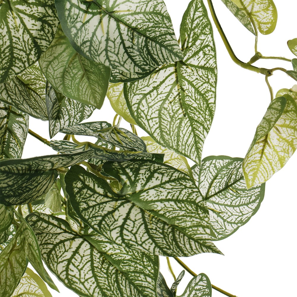 Artificial hanging caladium plant, 32''. With its speckled hanging foliage, it is clear that its presence brings some character to a room. Match it with a hanging rattan planter!