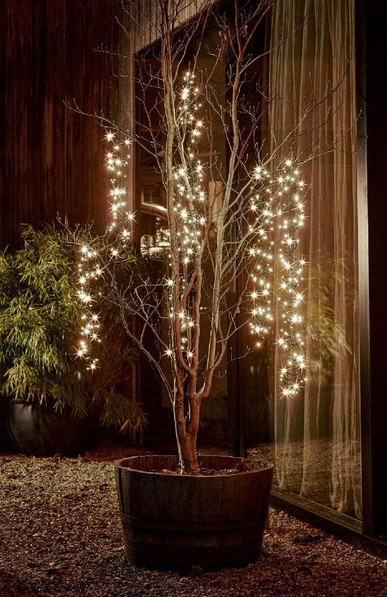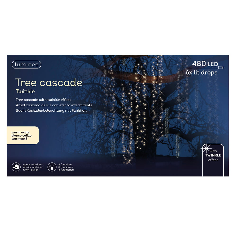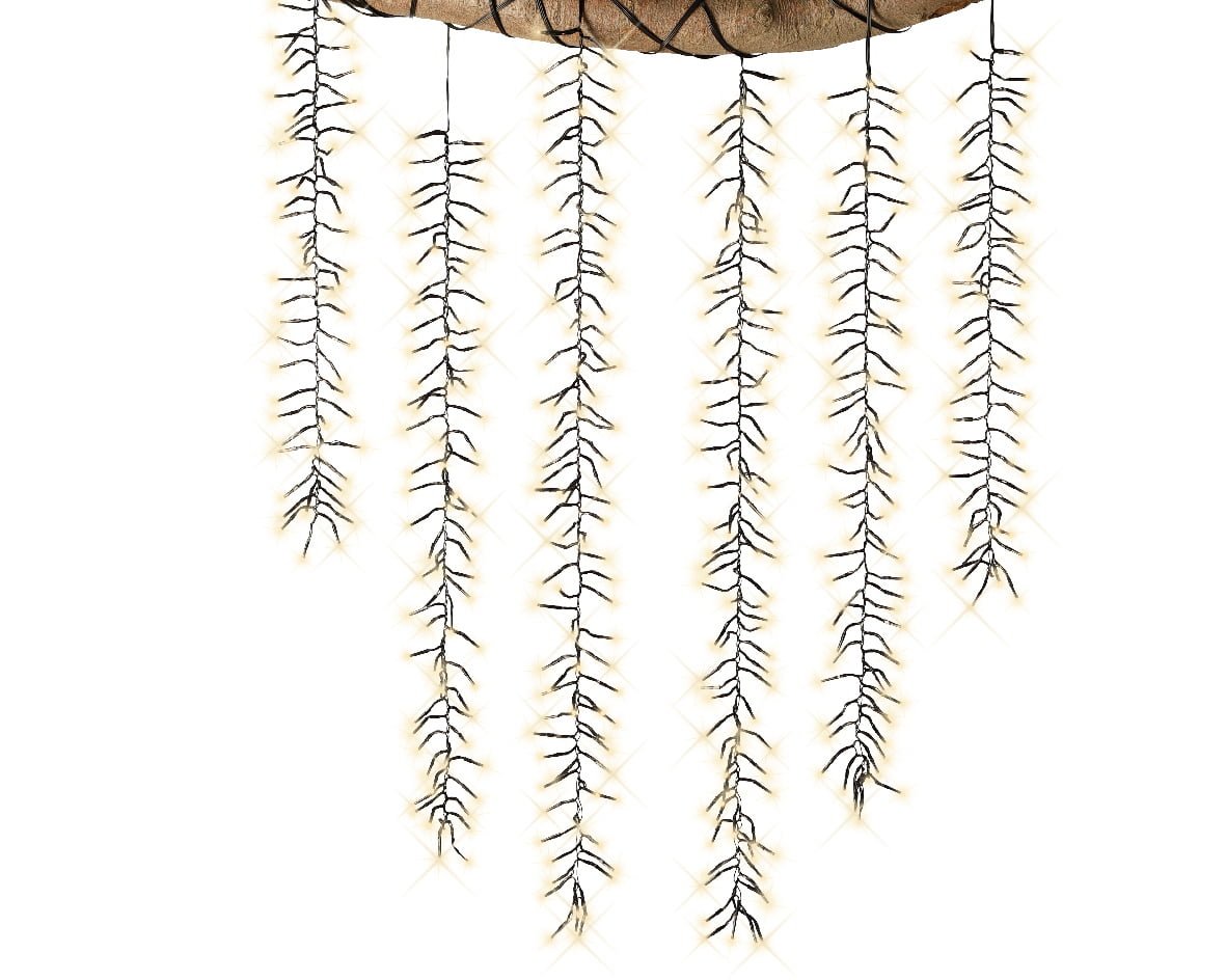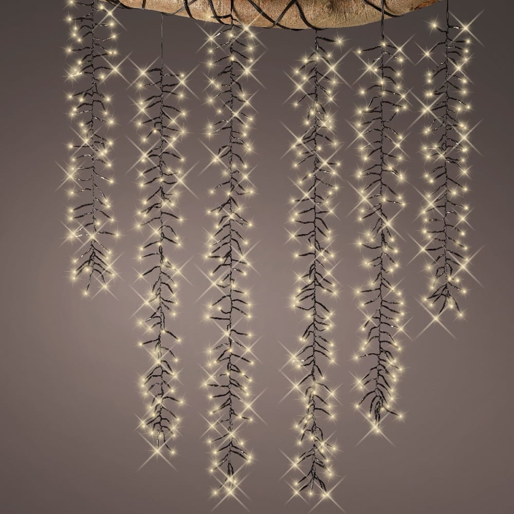 Icicle LED light cascade on black wire. Illuminate your outdoor tree or Christmas garlands with these 6 glittering hanging icicles! Features 8 functions. 480 LED lights. For indoor and outdoor use.