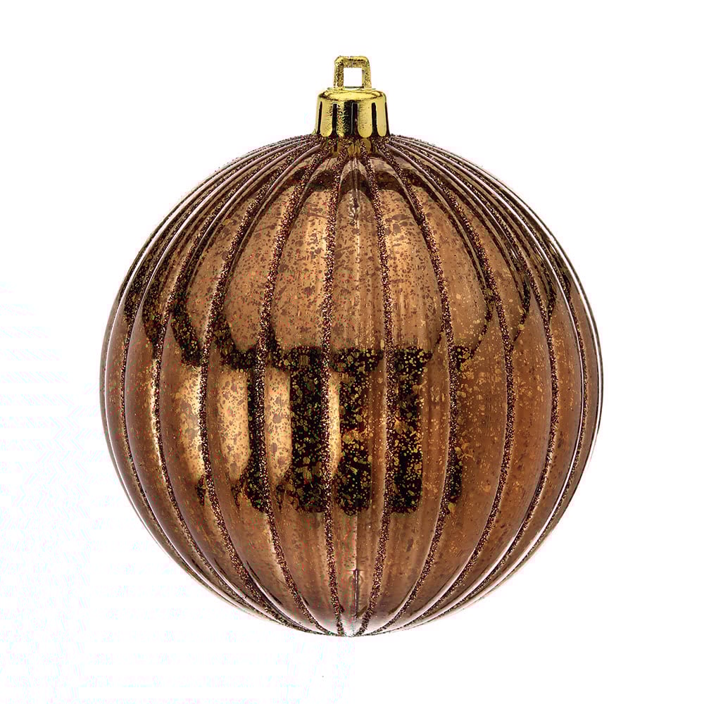 Box of ridged bronze mercury ornaments. Among our favorites, these glossy ornaments complete well the look of a tree next to warm lights! Accent your Christmas tree with traditional holiday baubles. Mix with complementary colors to finish up your holiday look. Create interesting, textured Christmas projects by tucking these ornaments into the hollow spaces of your tree. You could also hang them from the ceiling with fishing line to create an original garland of ornaments!