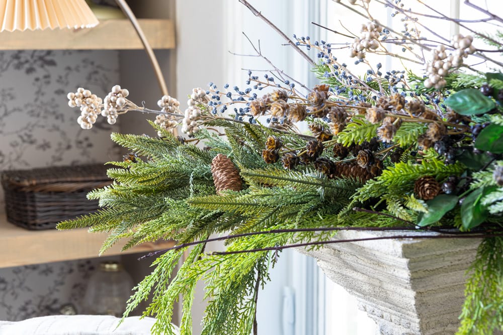 Artificial spruce branch with pinecones, 35”. There is nothing more versatile than this spruce branch filled with pinecones to create the most beautiful holiday decorations! Whether you want to add volume to your tree or place them in a large vase, this branch will amaze you with possibilities!