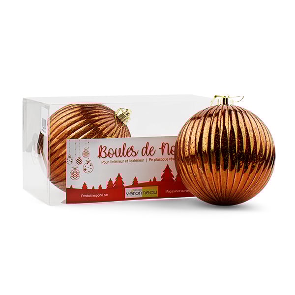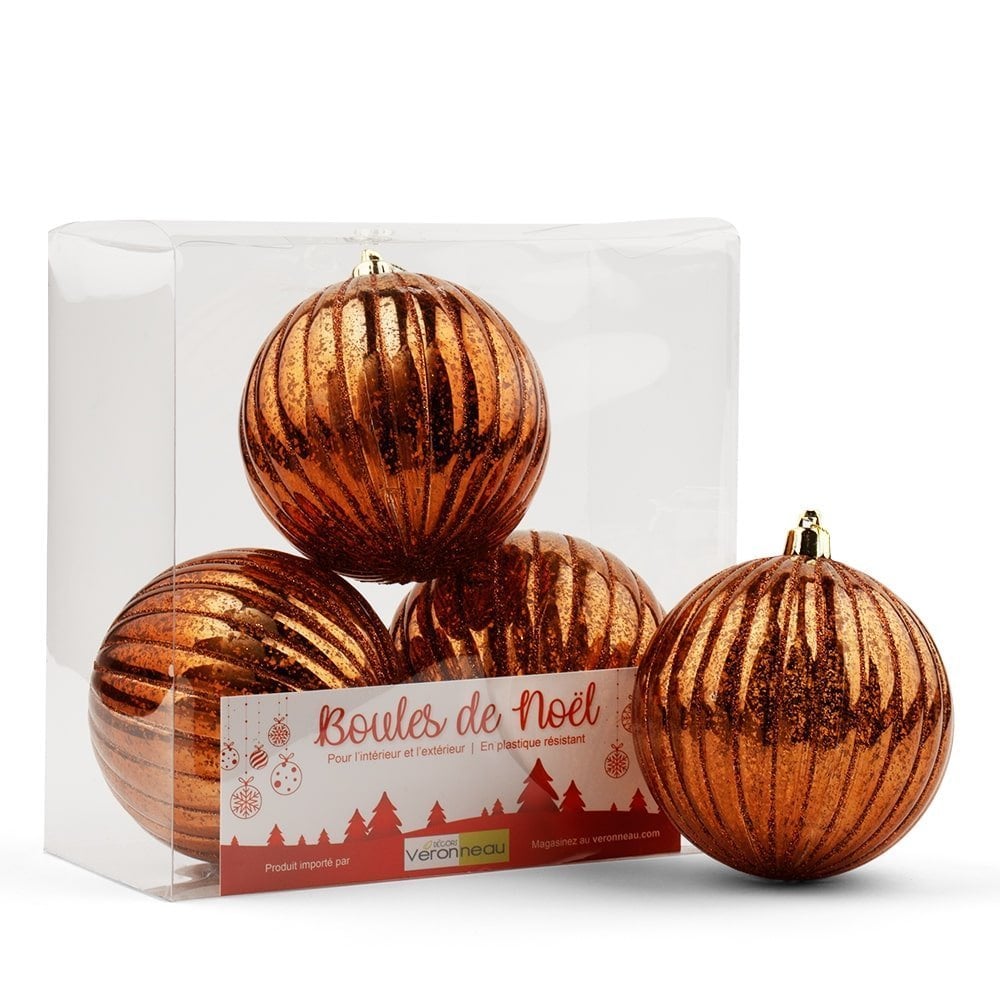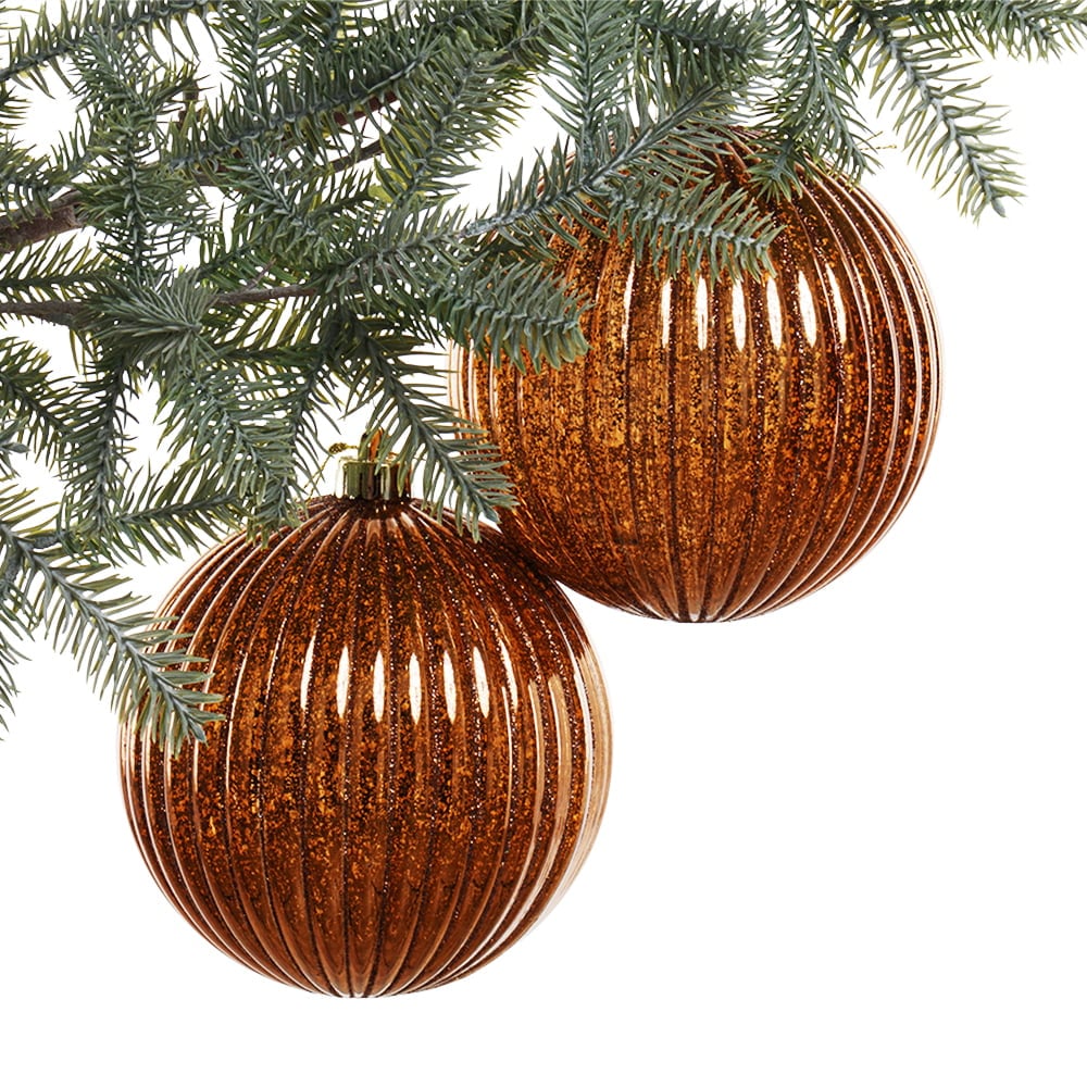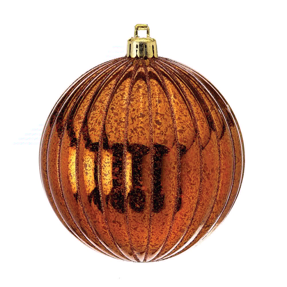 Box of ridged copper Christmas ball ornaments. Bring a warm, textured touch to all your Christmas projects with this classic and elegant set of oversized baubles. They are ideal for decorating larger trees and wreaths used for commercial and residential decors. Metallic accents are festive! Match them with gold baubles.