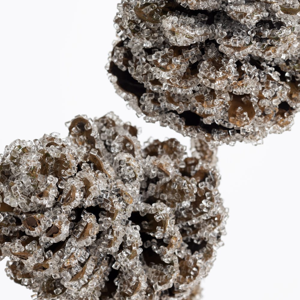 Frosted pinecone double branch, 28”. Discover this duo of frosted pinecones, a winter decor piece that evokes the splendor of the cold season. The pinecones are delicately covered with sparkling frost, creating an authentic, natural ice effect.