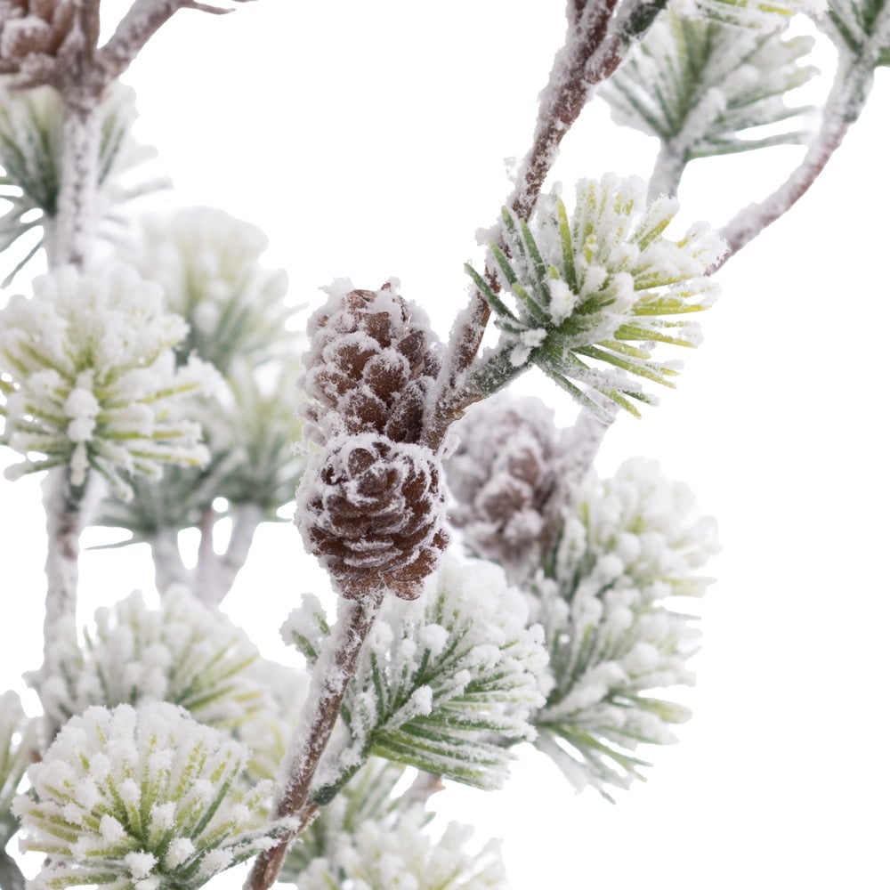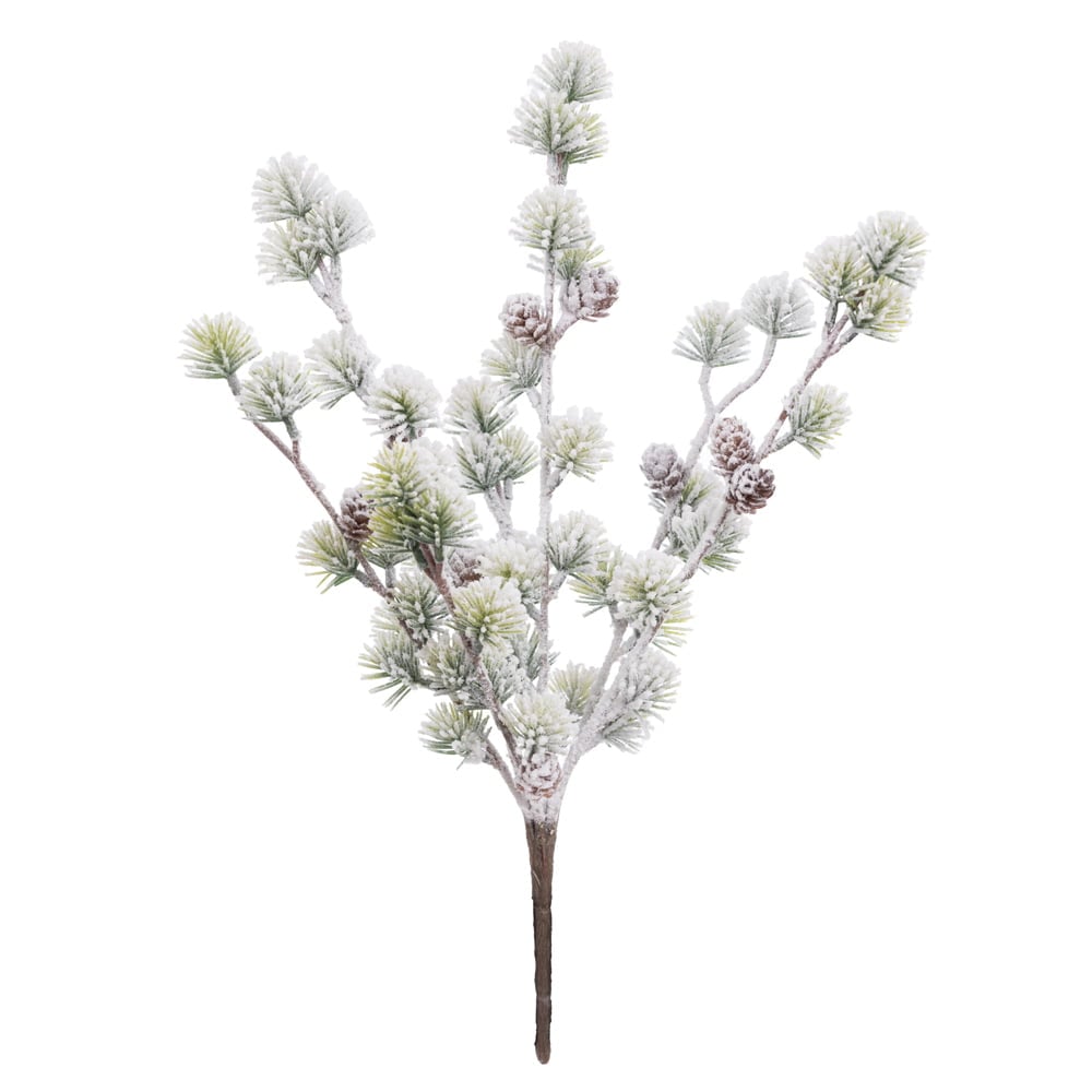 Artificial flocked pine bouquet with pinecones, 17”. This snow-covered pine ball stem is just the thing to fill in the gaps on your Christmas tree! The flocked look goes well with red or rustic ornaments.