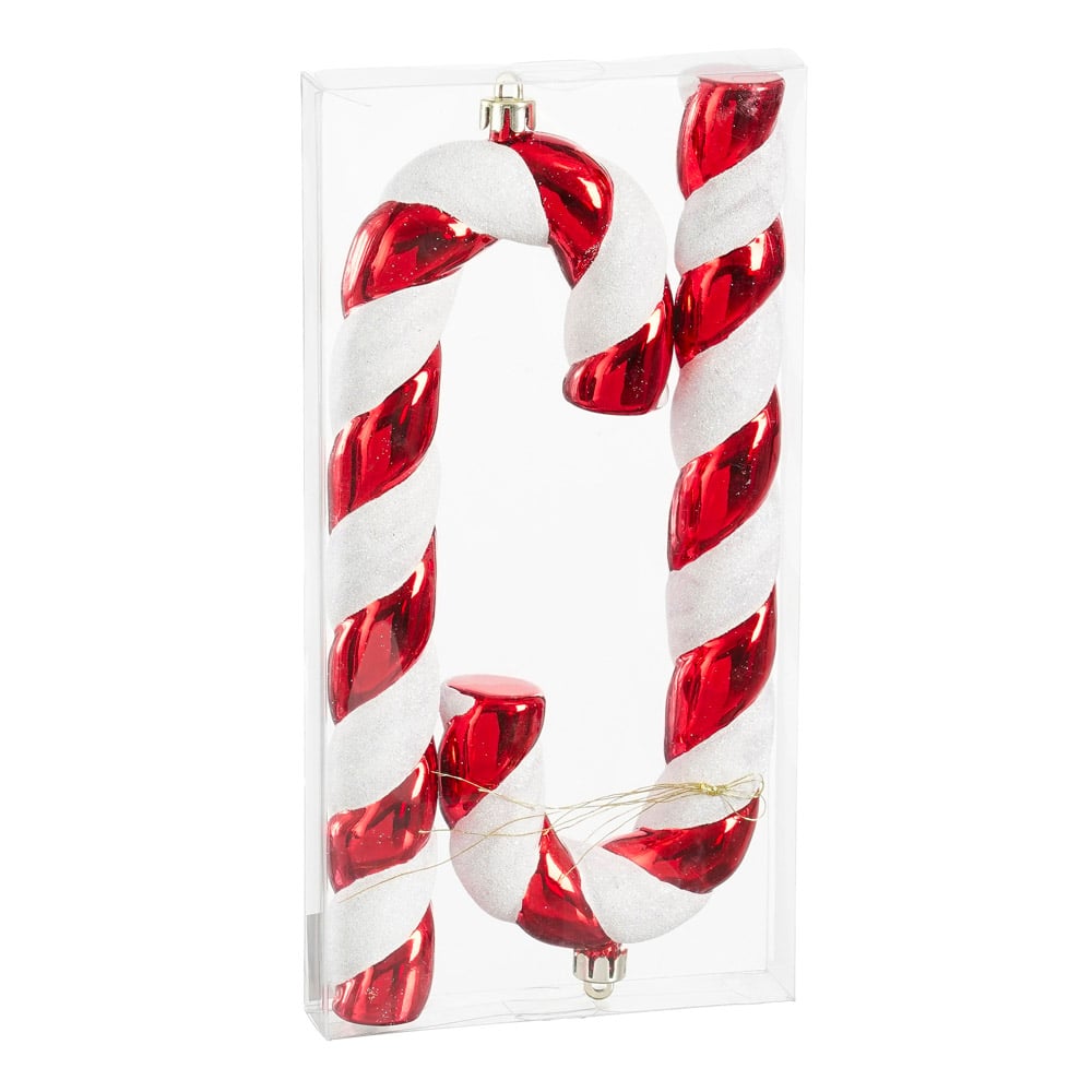 Set of 2 Christmas candy cane ornaments, 10”. Perfect for a sweet-themed tree, these candy cane-shaped ornaments are a must-have! Pair them with bakery-style ornaments such as pretzels, kitchen utensils, desserts, candies, and more. Made in recycled polystyrene material.