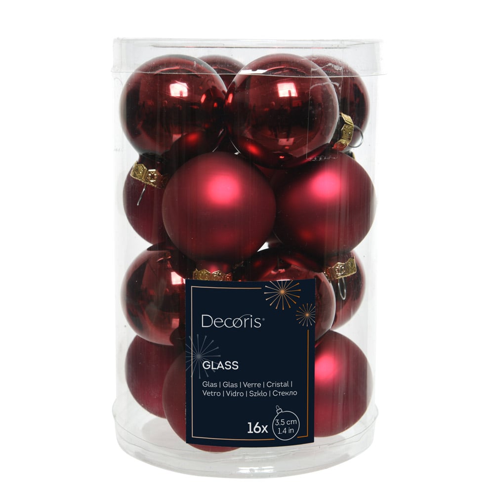 Box of 16 small burgundy glass ornaments. A must-have for all your holiday creative projects: wreaths, garlands, Christmas trees, and holiday arrangements! The burgundy color pairs beautifully with black and felt decorations. Other colors are also available.