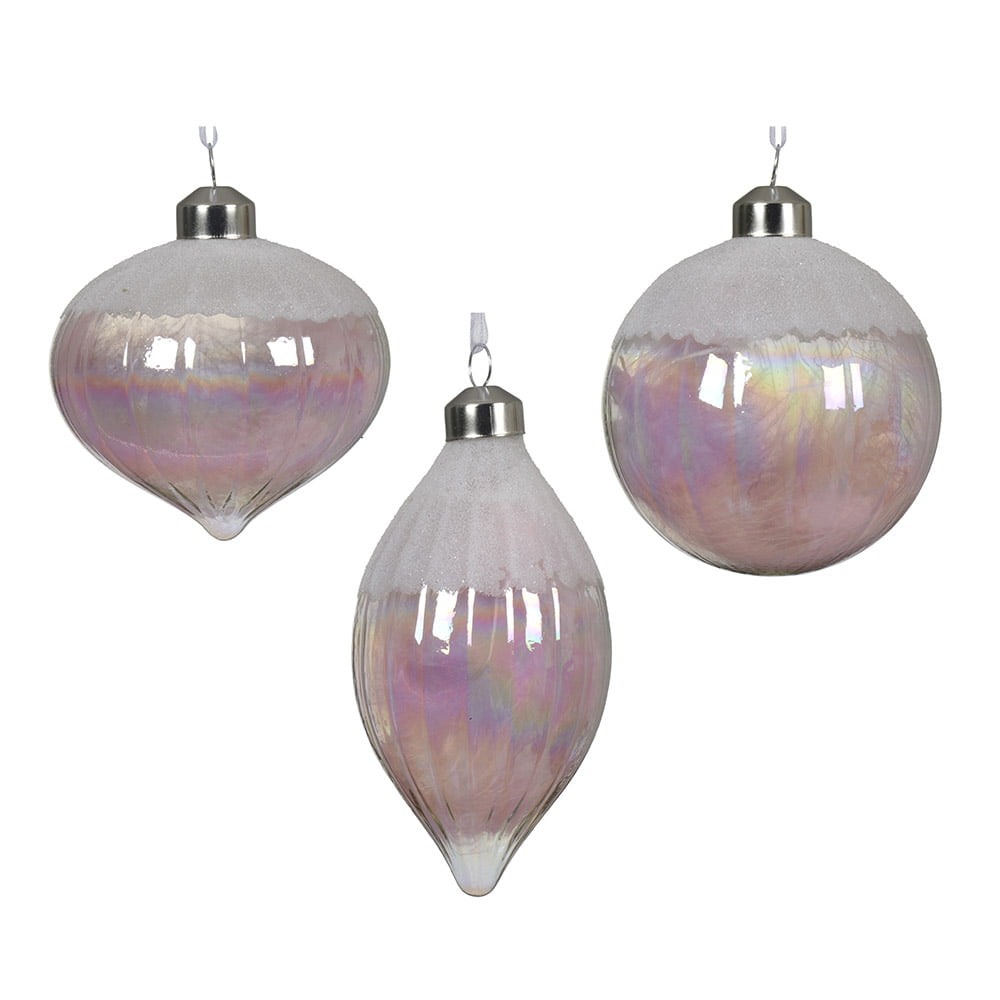 Light pink glass Christmas bauble with iridescent finish, 3”. Pink lovers will be excited to discover this trio of matching baubles in an iridescent finish. The different shapes will add dynamism to your Christmas tree decoration. Price per unit.