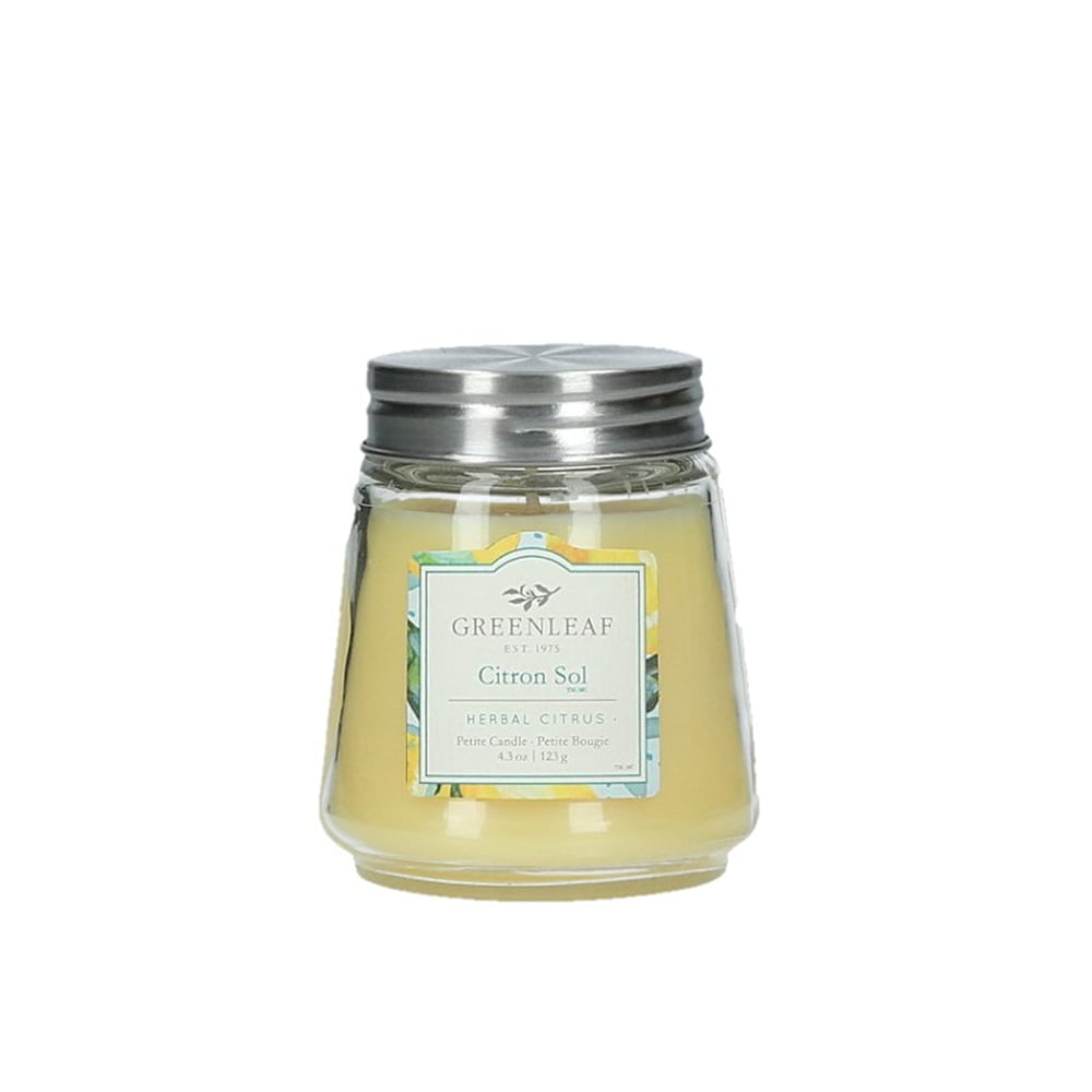 The small 4.3 oz. Citron Sol scented candle comes in a stylish glass container. Simply place it on a bedside table or living room table to enjoy its fresh, lemony scent. Brand: Greenleaf.