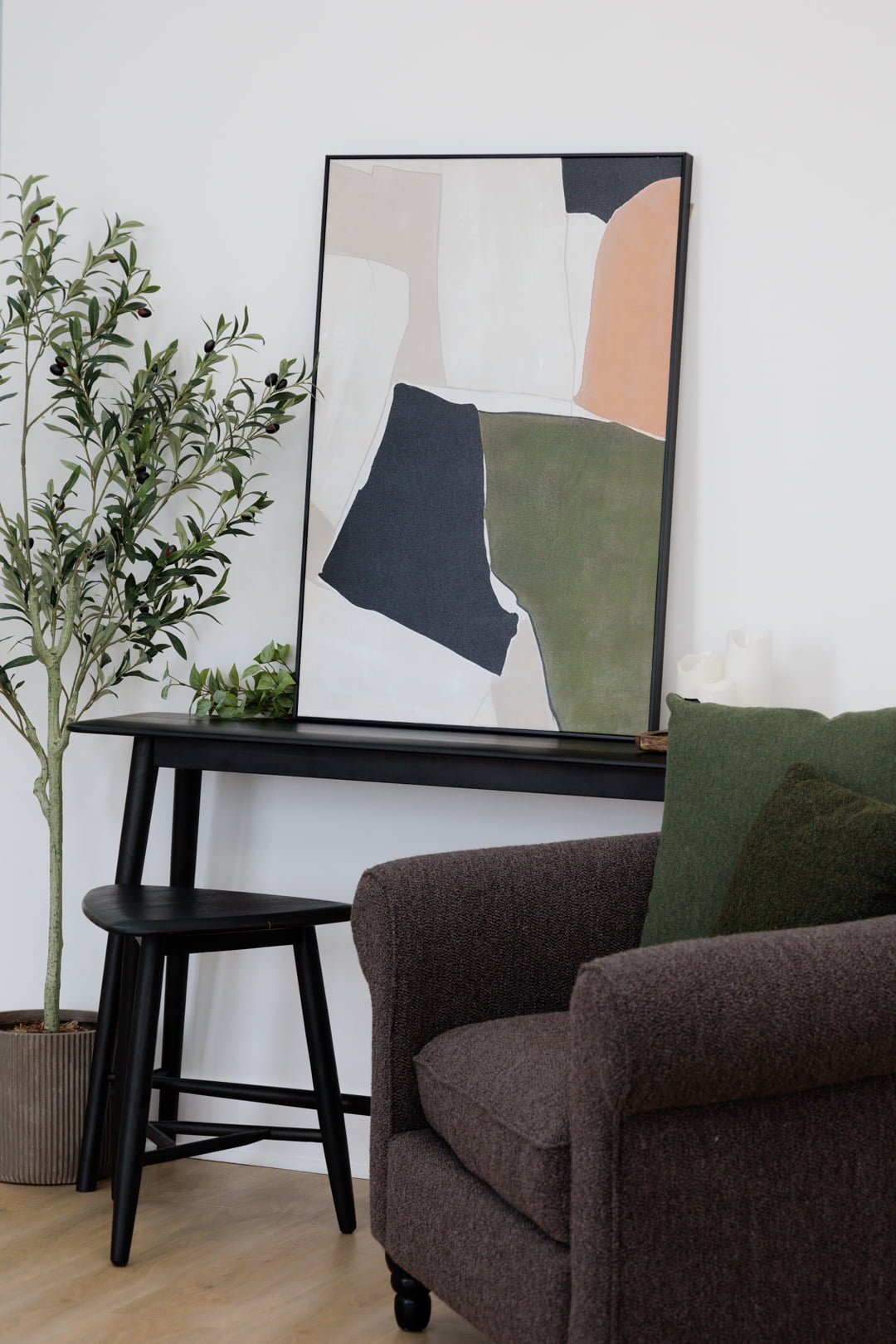 Abstract shapes wall art, 24 x 36''. This printed canvas will bring a visually appealing artistic edge to your room! Make this modern painting the masterpiece of your office or living room decor. Comes with black MDF frame.