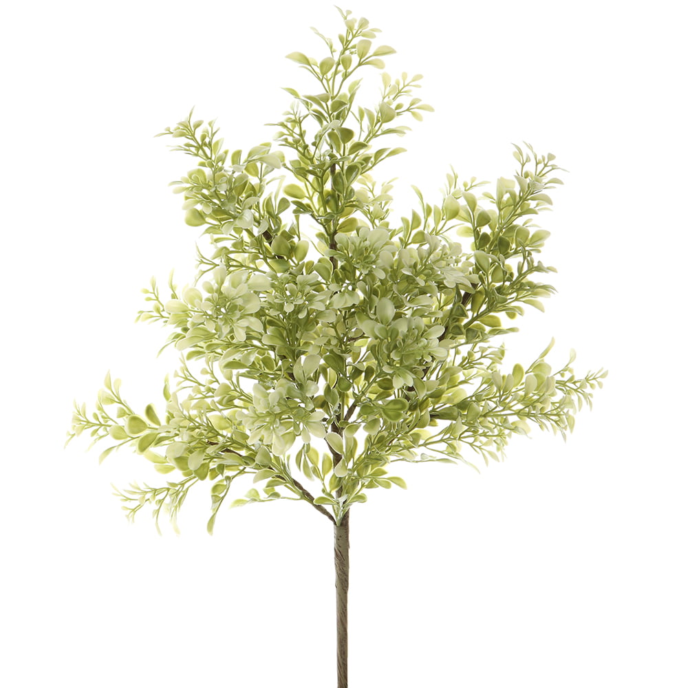 Artificial light green boxwood stem, 18,5”. Use this light green boxwood pick to adorn a clear glass vase. Set it on your coffee table with vibrant pink peonies and lilac. You may even wrap it up and gift it to someone your love.