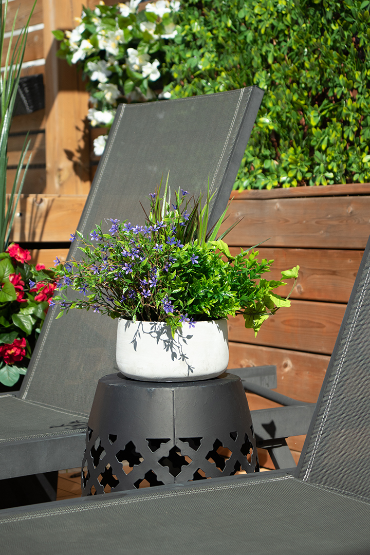 Artificial centerpiece, measuring 14 x 16”, made of purple flowers and mixed foliage. It’s perfect as an outdoor floral arrangement. To protect your artificial flowers from the sun for longer, spray them with UV protection at the beginning of each season.