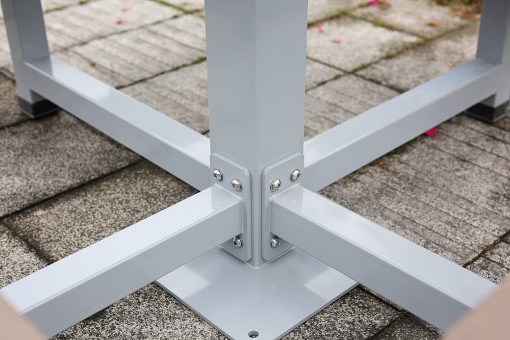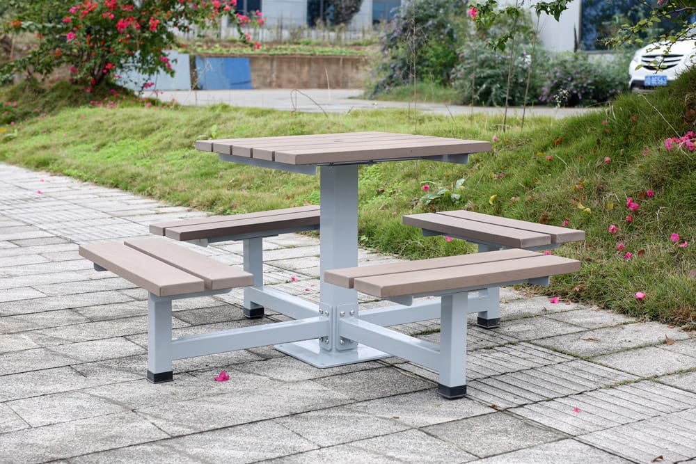 This brown composite picnic table measures 30” high and includes a 1.5” hole for an umbrella. Commercial grade with heavy duty stainless steel frame. Perfect for a park, restaurant or dairy shop. Structure in 201 stainless steel with outdoor powder coating. Weight: 121 kg.