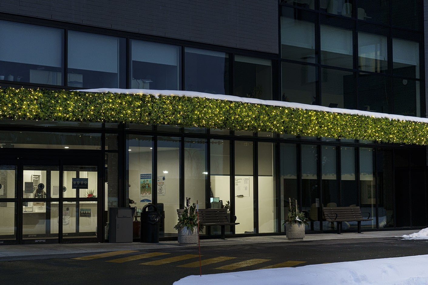Creation of a custom decor for the front door of this Laval retirement home. Artificial boxwood foliage was added in a long horizontal strip in which warm white LED lights were installed. Addition of a luminous metal Christmas tree near the building’s main entrance.