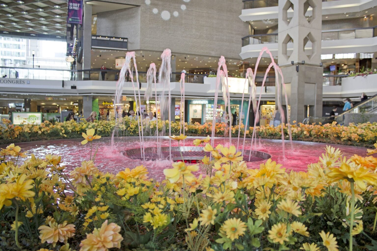 Addition of yellow artificial flowers intertwined with artificial greenery, around the majestic fountain at Complexe Desjardins common area. Several types of flowers, such as daylilies, peonies, dahlias, daffodils, etc., placed on the existing structure at the base of the fountain.