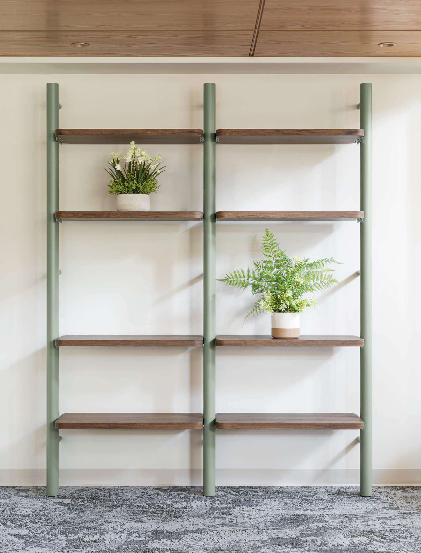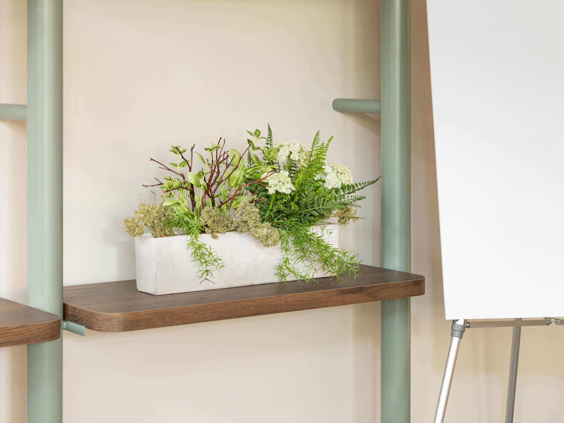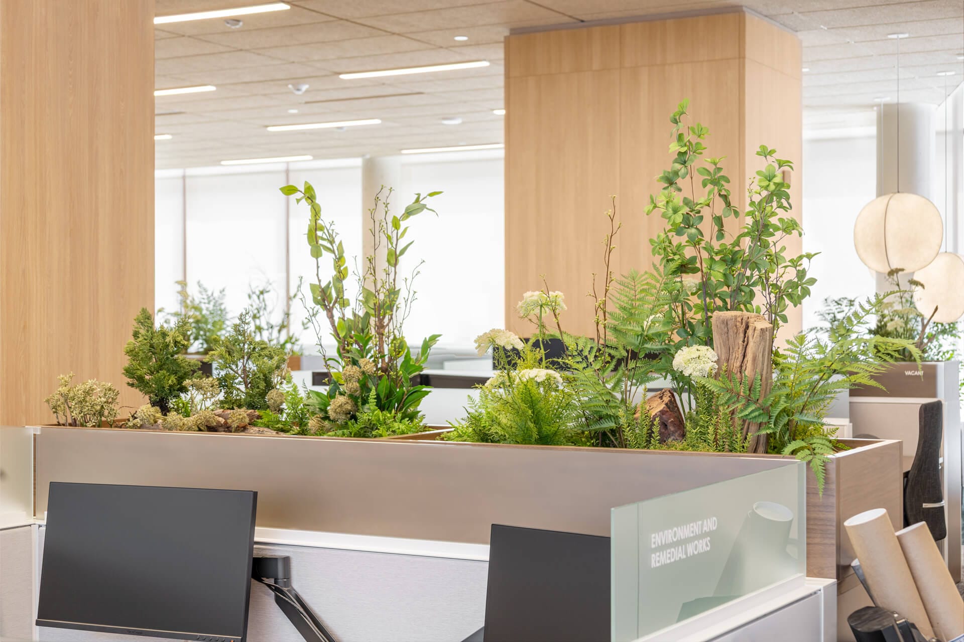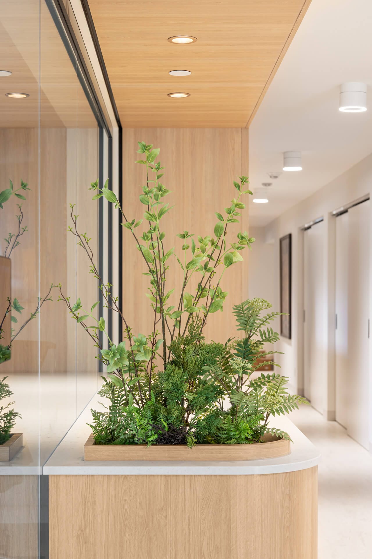 We installed a selection of artificial plants including cedar, ferns, bark, green moss, and wild grasses. These elements were incorporated as plant inserts, potted plants, decorative arrangements, and handcrafted trees with natural trunks.