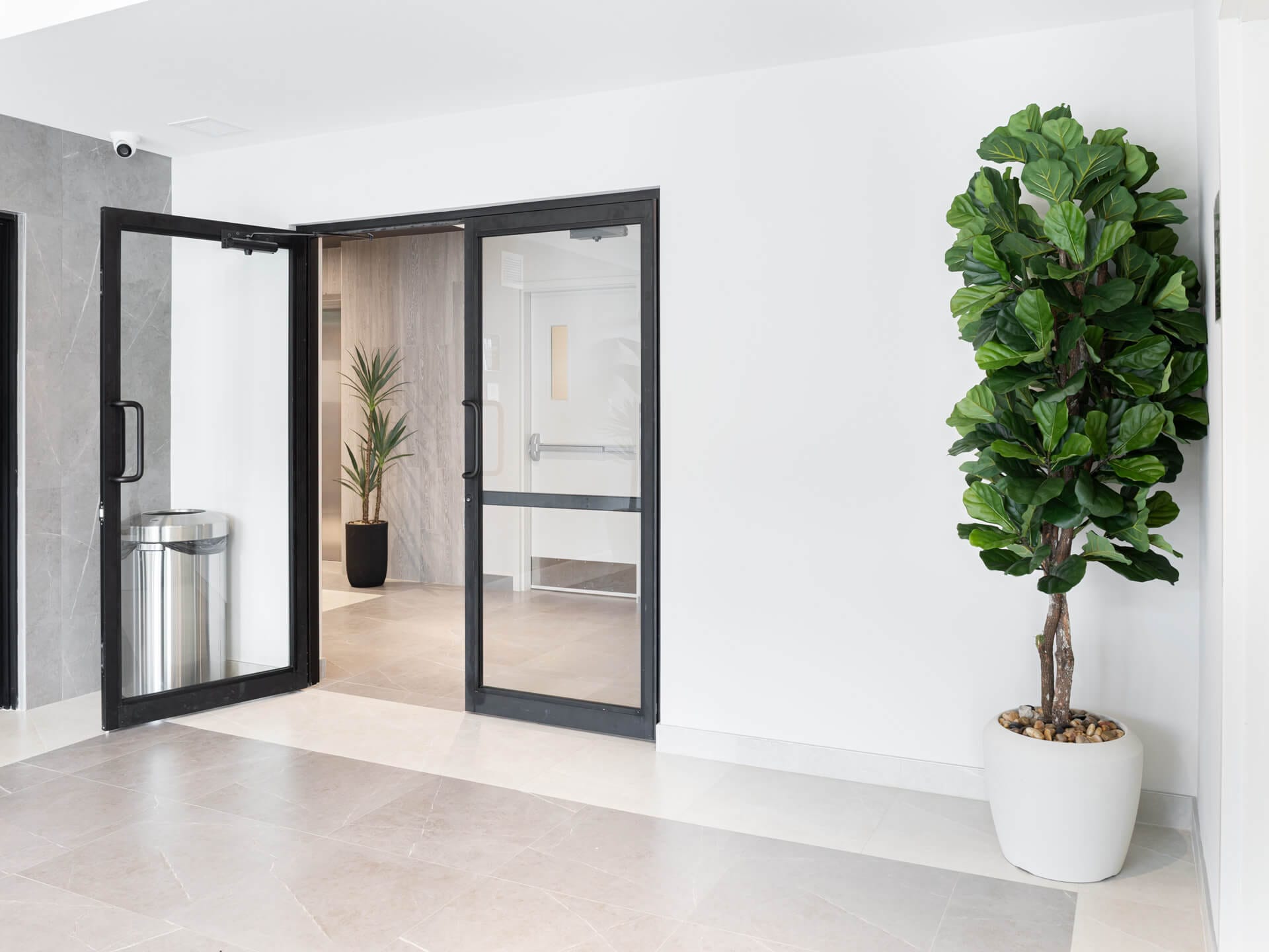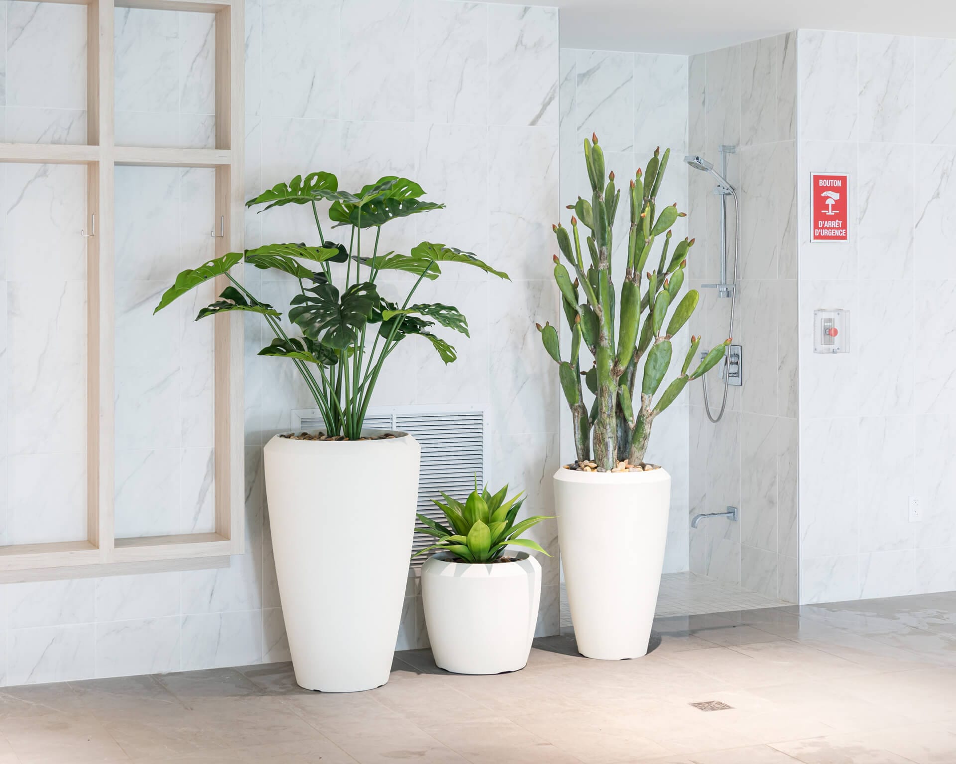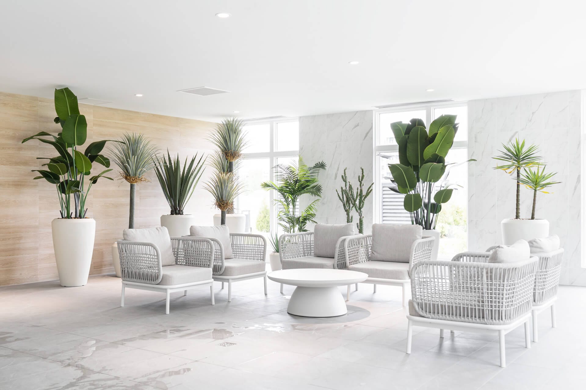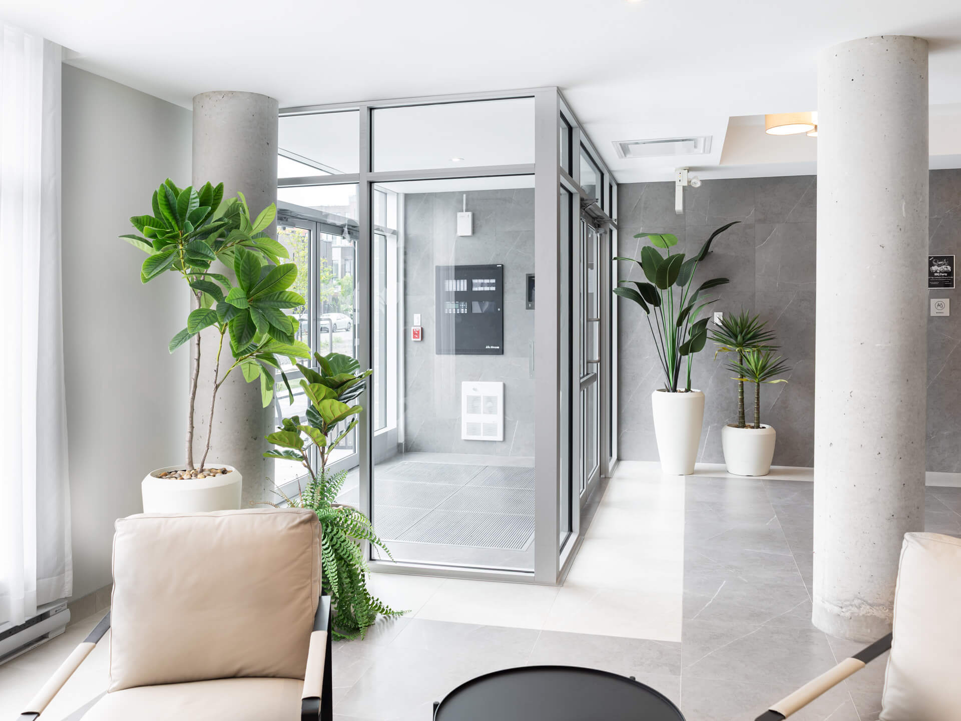 Located in the heart of Saint-Laurent, Montreal, Liveo Bois-Franc is a modern rental condo complex that combines architectural elegance, comfort, and style. From the moment you step inside the building, we wanted to create a striking first impression. The naturally lit lobby is perfectly suited to showcasing realistic artificial plants with varied foliage.