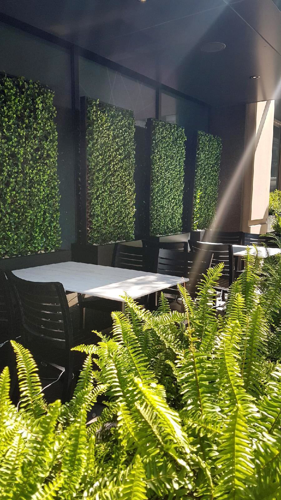 Installation of artificial boxwood hedges on the terrace of the Ritz-Carlton in Montreal. This type of dense foliage adds privacy to this outdoor space.