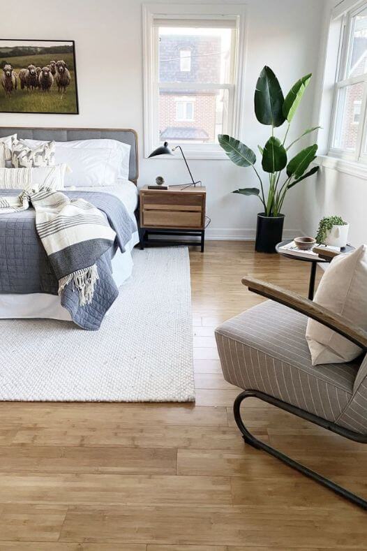 Eclectic style is not going anywhere this year. This time, you will see it in bedroom decors. The mix of old elements like the traditional rug, with more modern accents like tropical plants, makes the whole more sophisticated. Our favorite part of this space ? The corner of the room that has been redesigned to create a reading area with a canna plant and a coffee table.