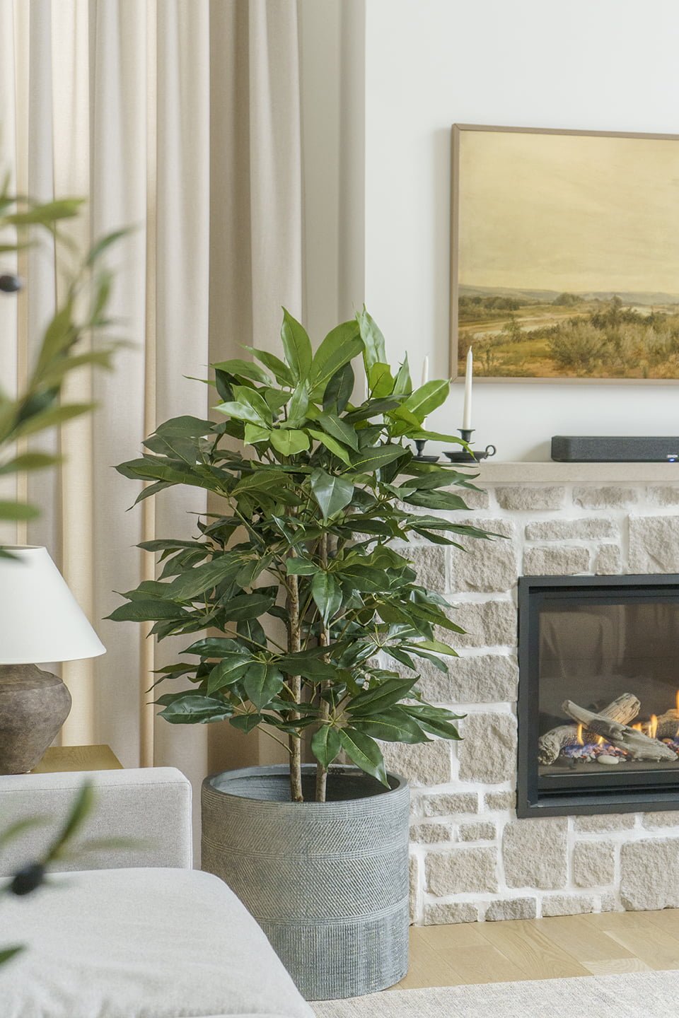 Placez un ficus artificiel de 6 pieds dans un coin pour donner le ton au design d’une pièce.