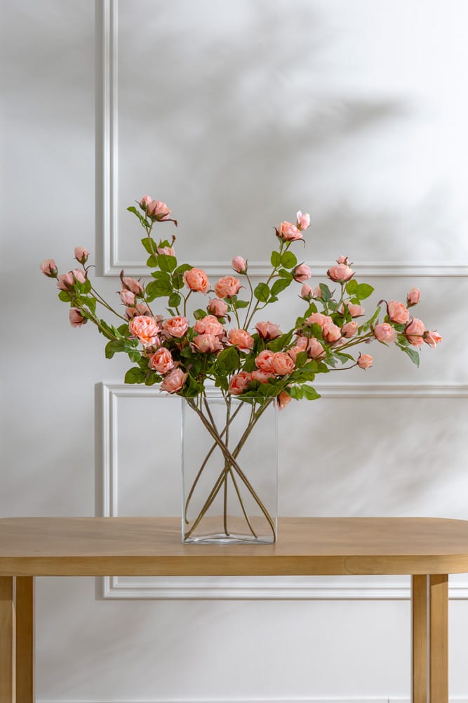 Tige de rose grimpante saumon artificielle, 37″. Ces fleurs corail de rosier grimpant se combine à merveille aux autres végétaux classiques comme les pivoines, les gypsophiles et les delphiniums. Vous pouvez également les utiliser seules dans un gros vase de verre pour un style cottagecore.