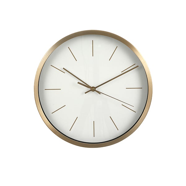 Horloge murale contemporaine blanche au contour doré, 10 x 10″. Cette horloge sans chiffres combinée à sa couleur dorée est sans contredit un accessoire déco moderne ! Autres formats et couleurs disponibles.