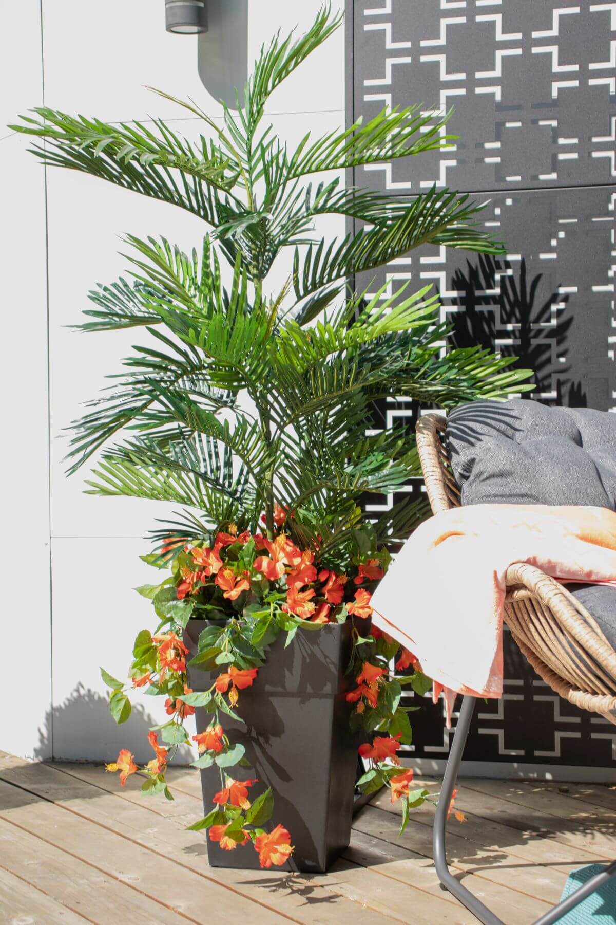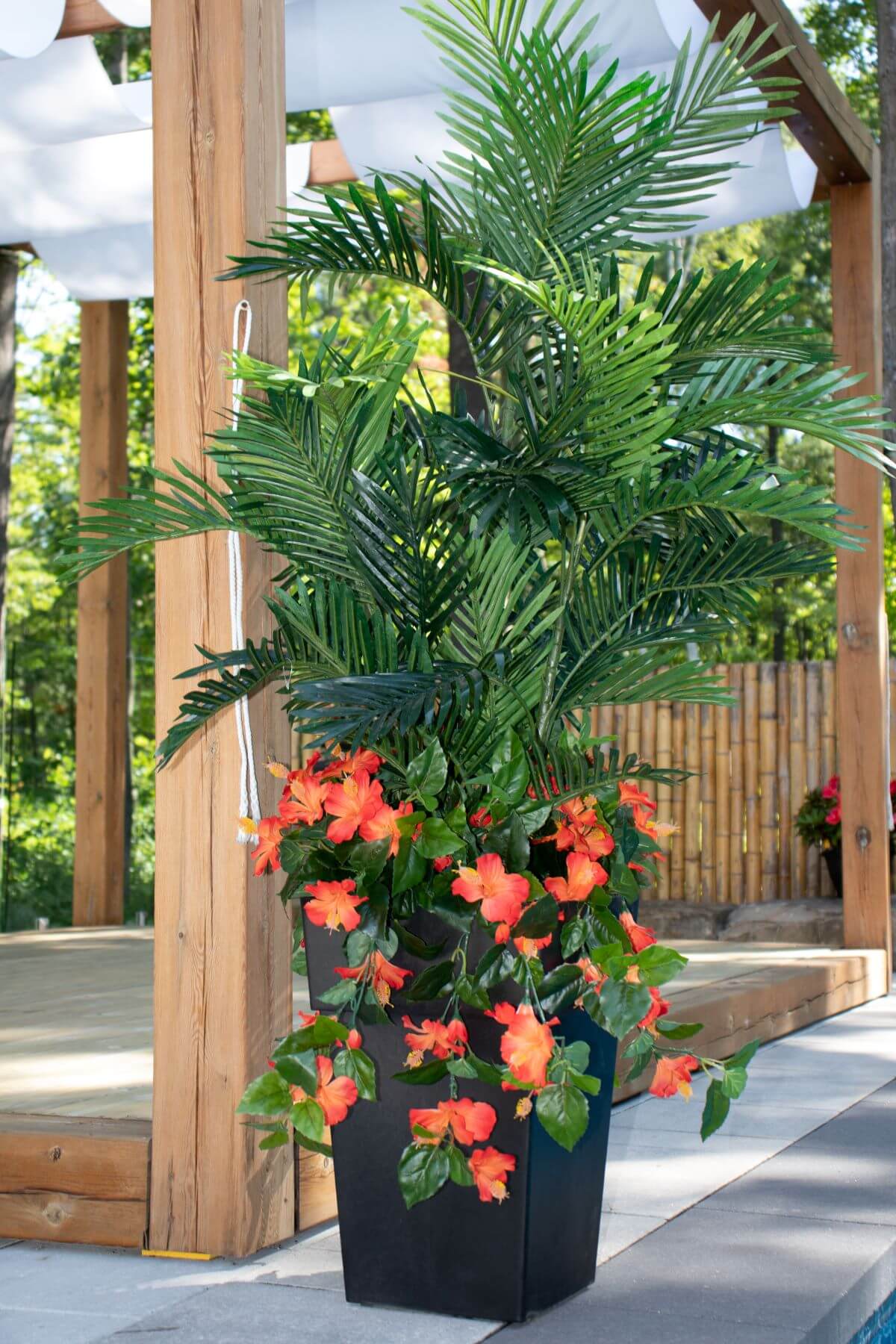 Arrangement floral extérieur avec palmier de type areca et fleurs d’hibiscus orange dans un pot noir. Garantie d’un an contre la décoloration causée par les rayons UV.
