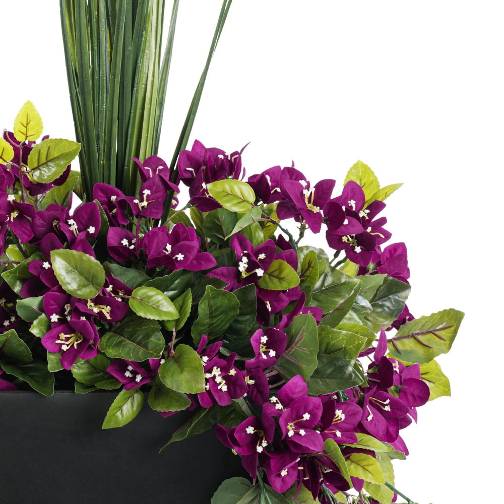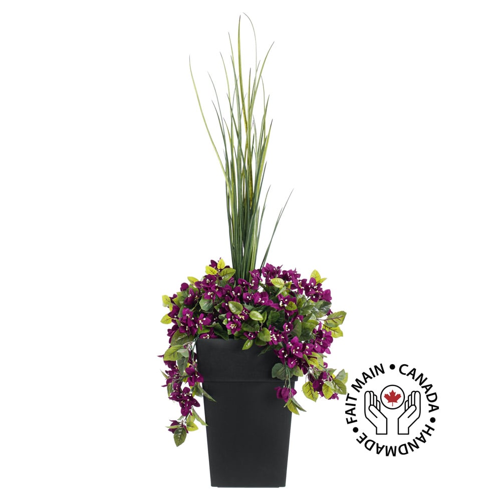 Jardinière extérieure de bougainvillier mauve artificiel, 50”. Faites-vous plaisir cet été en choisissant la tranquilité d’esprit, grâce aux arrangements floraux artificiels pour l’extérieur ! Ce nouveau modèle aux fleurs mauves colorées conviendra à tous les styles d’aménagements. Ce modèle vient dans le pot noir montré sur la photo, dans lequel une couche de roche a été ajoutée afin de créer du poids à l’arrangement. La plante a ensuite été fixée dans l’uréthane, puis une couche finale de paillis a été ajoutée en guise de finition.