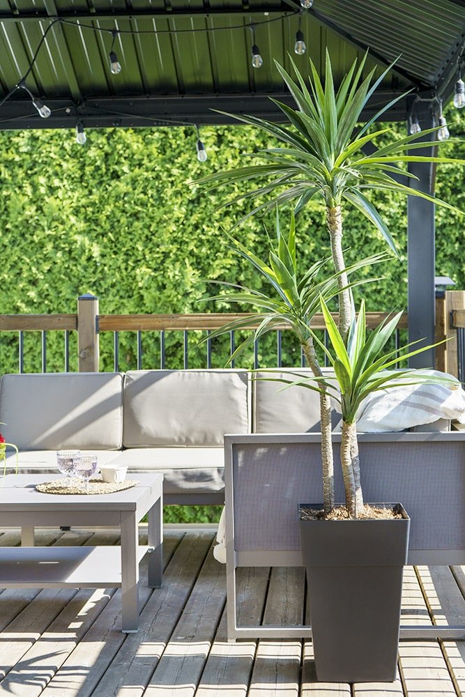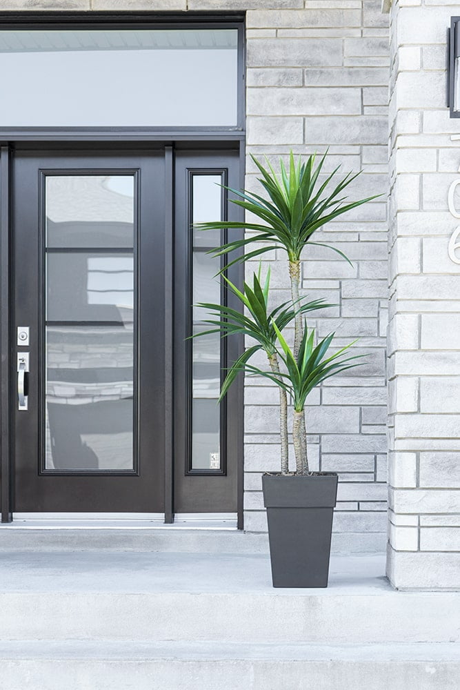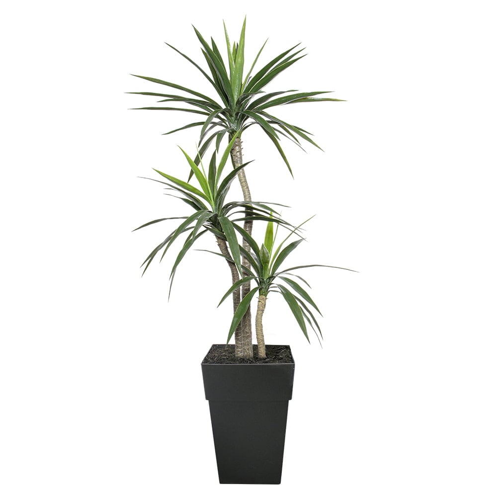Yucca artificiel extérieur en pot, 65″. Cette plante pour terrasse offrira un style moderne à tous les aires de vie dans lesquelles elle sera installée. Ce modèle vient dans le pot montré sur la photo, dans lequel une couche de roche a été ajoutée afin de créer du poids à l’arrangement. La plante a ensuite été fixée dans l’uréthane, puis une couche finale de paillis a été ajoutée en guise de finition.
