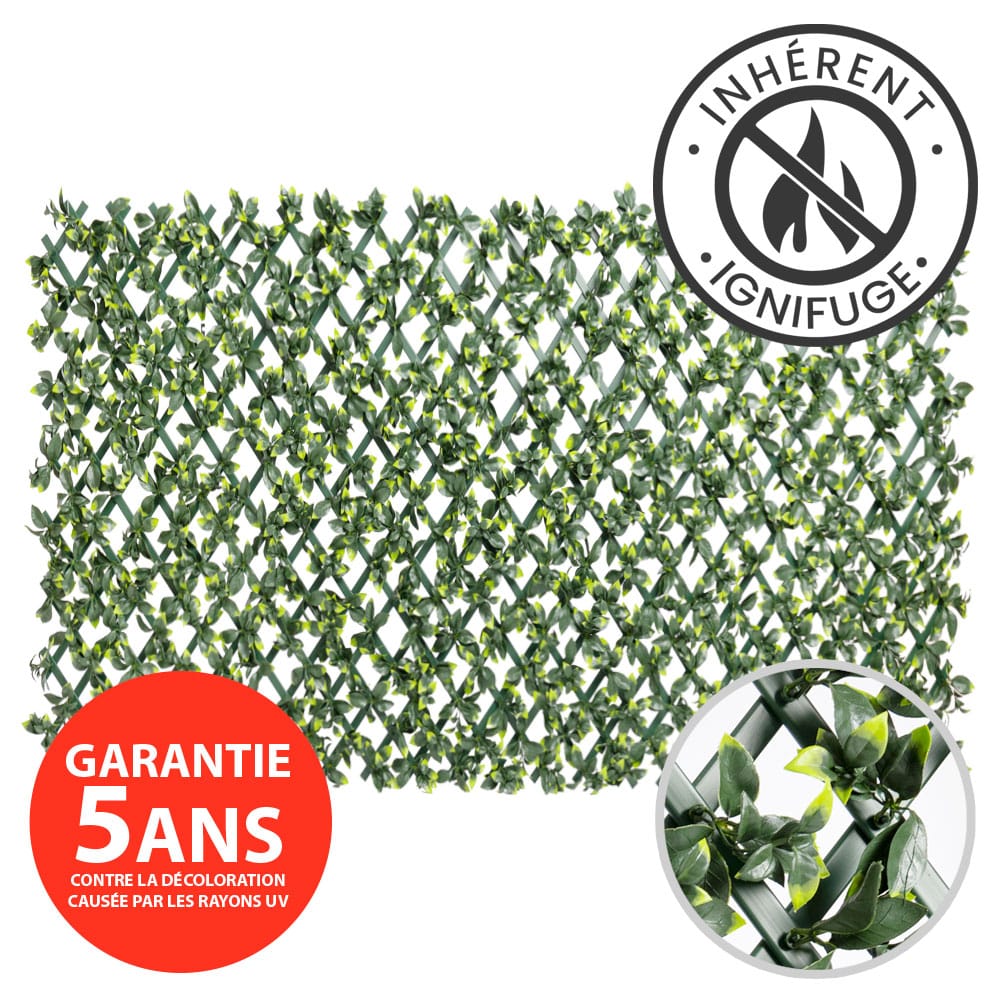 Notre treillis meilleur vendeur est maintenant offert en version ignifuge! À qui s’adresse ce produit? Aux commerces, entreprises, restaurants, résidences et complexes. Considérés intrinsèquement ignifuges, les treillis extensibles de feuillage artificiel sont composés d’éléments ininflammables qui les rendent sécuritaires en cas de feu. Il s’agit donc d’une solution parfaite dans les lieux publics où certaines normes sont beaucoup plus strictes et exigent ce standard. Vérifiez avec votre municipalité pour connaître les normes à ce sujet!