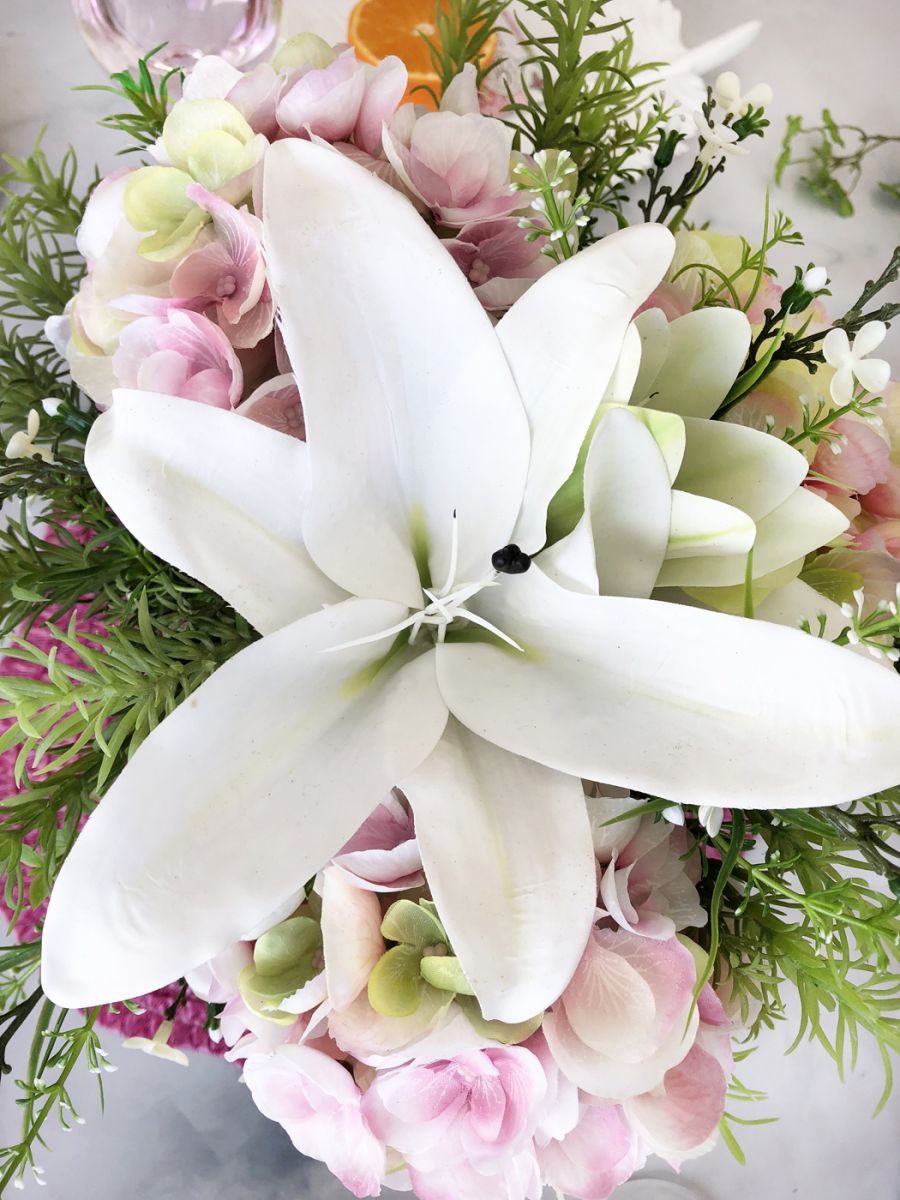 Il n’y a rien de mieux que cette fleur artificielle classique de lys blanc, d’environ 7 pouces de diamètre pour illuminer un bouquet de fleurs artificielles.