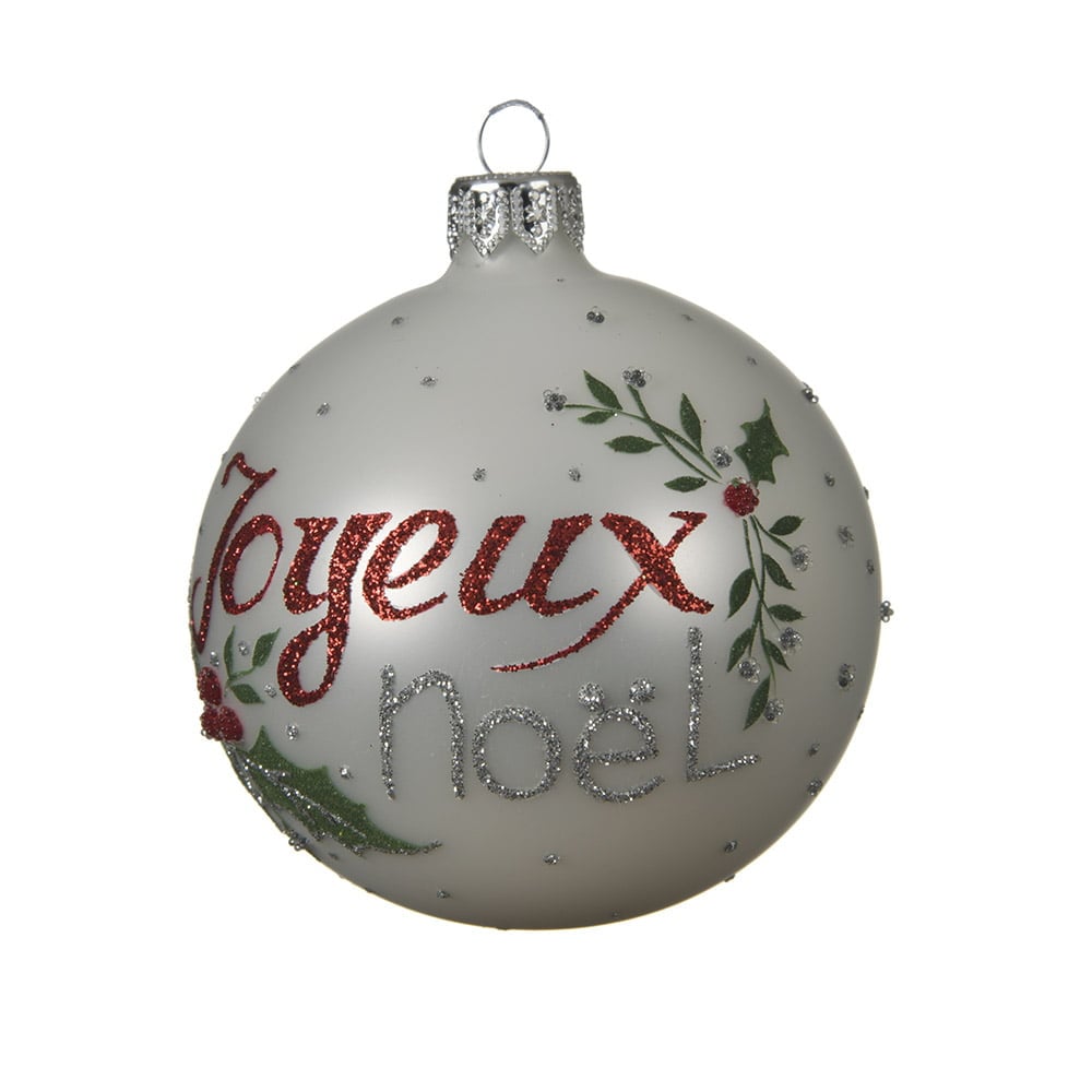AccueilDécorations de NoëlBoules de NoëlOrnements gris et argentOrnement Joyeux Noël en verre soufflé, 3″