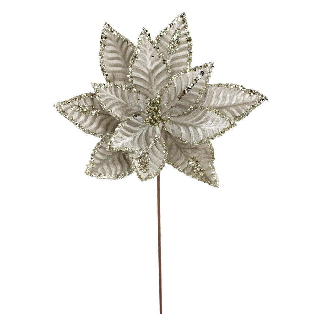 Poinsettia platine sur tige mesurant 22″. Conservez l’aspect traditionnel de cette fleur de Noël tout en sortant des sentiers battus au niveau de la couleur!