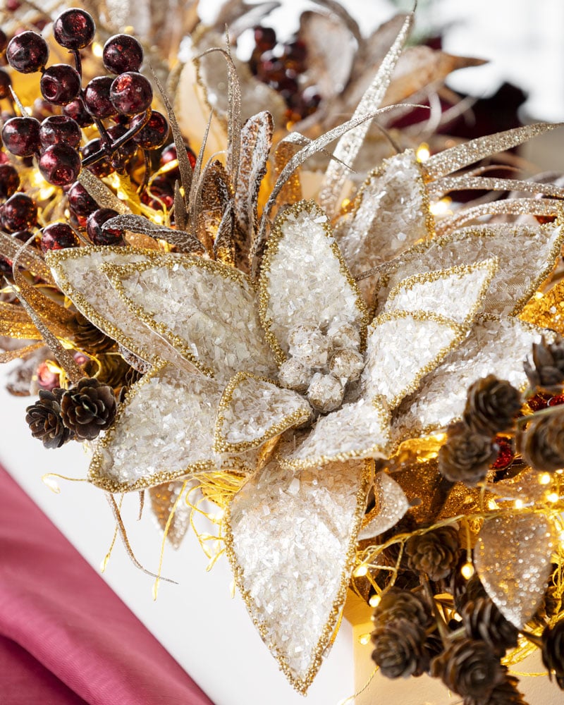 Fleur de Noël poinsettia perlé champagne avec brillants. Tous les éléments sont ici réunis pour donner la fleur de Noël la plus chic qui soit: brillants, perles et couleur champagne! Utilisez ce poinsettia comme élément central de votre futur centre de table festif.
