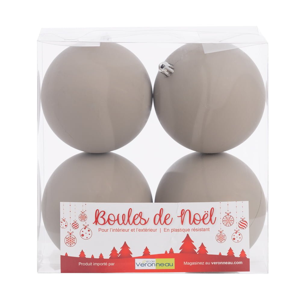 Boîte de 4 boules de Noël grises fini mat, 4″. Rehaussez votre décor de Noël extérieur, comme vos couronnes, guirlandes et arrangements avec ces ornements gris en plastique à l’épreuve des chocs. Pour un usage intérieur et extérieur.