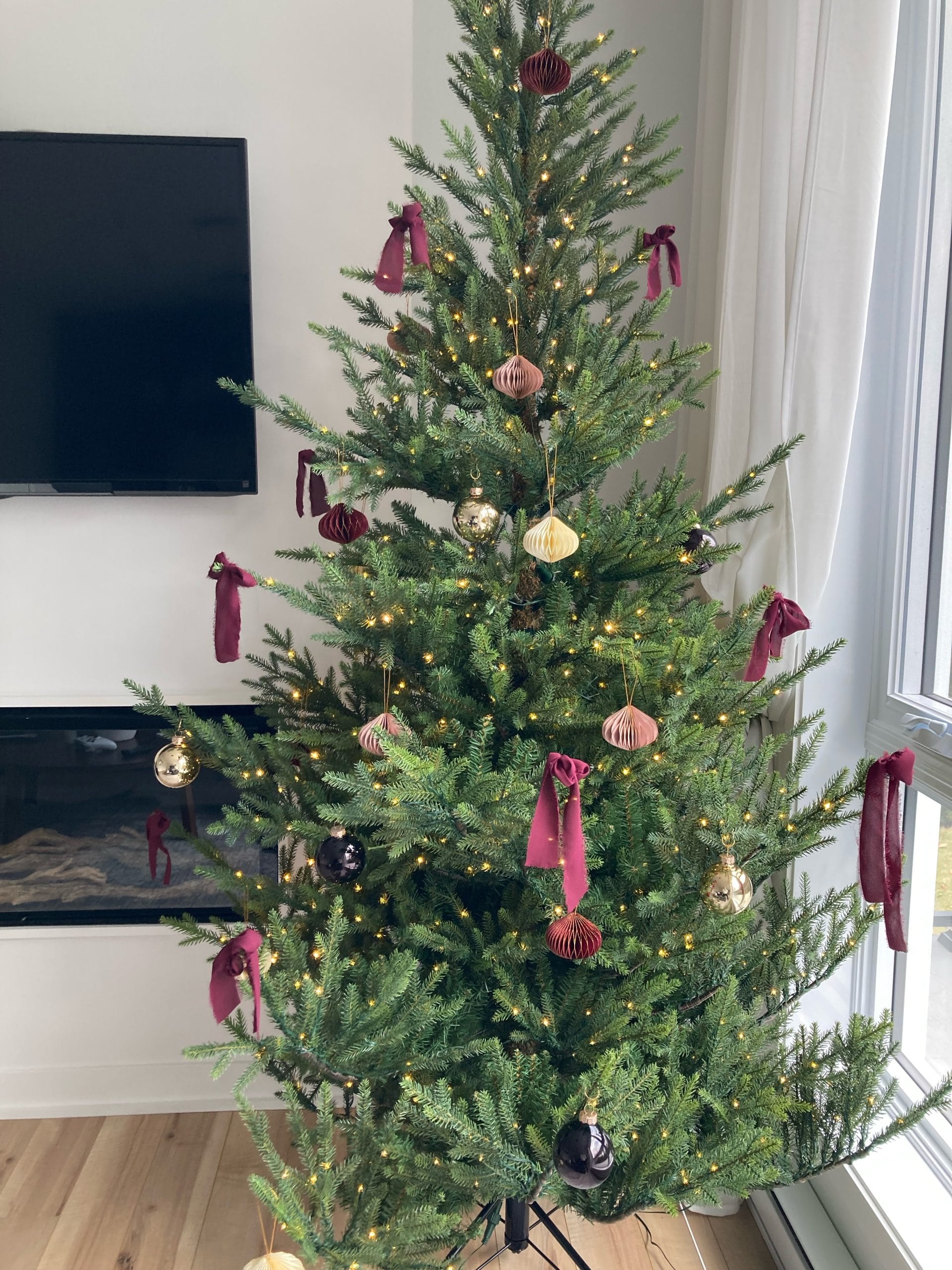 Je suis tellement satisfaite! Pour un sapin de Noël artificiel, il semble vraiment réaliste et les lumières sont féériques, belle qualité! Vient aussi avec un sac de rangement