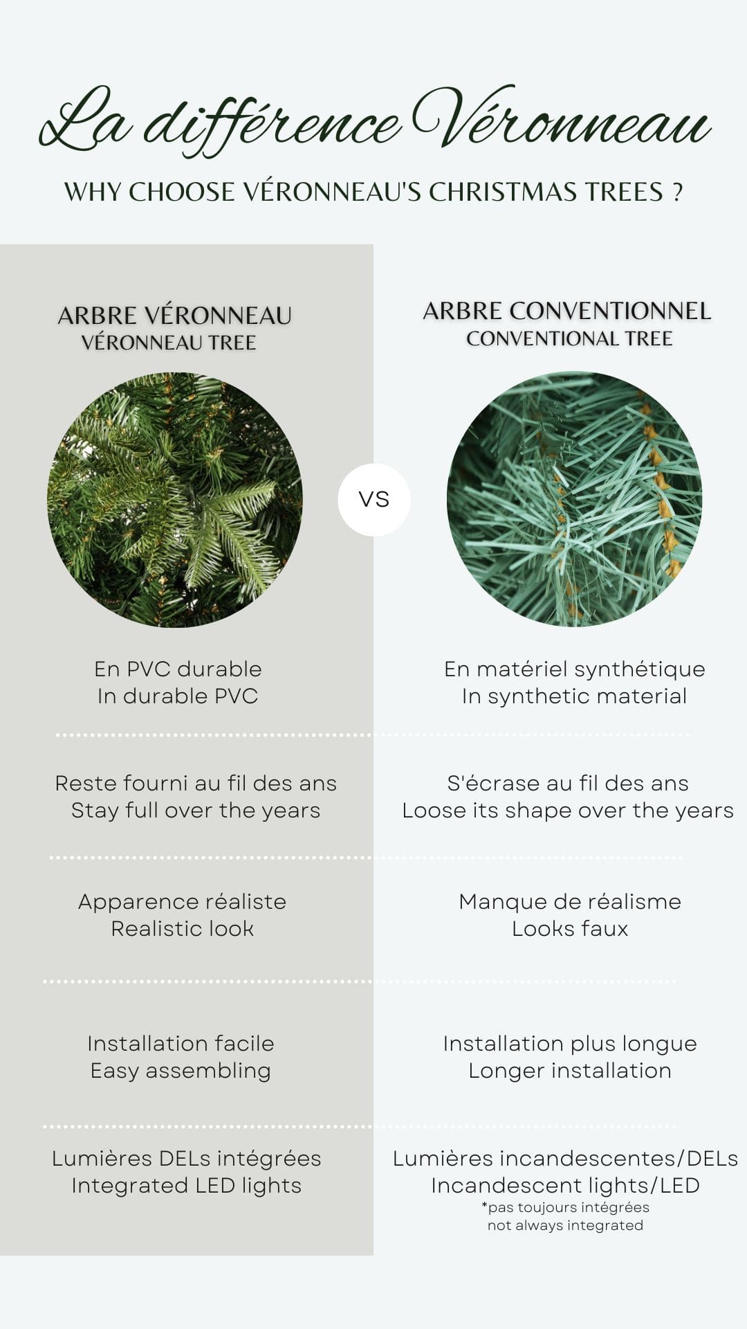 – Sapin de 9 pieds (108″) : 1200 micro lumières DEL, 104 branches, 7 410 pointes, pied en métal de 80 cm de diamètre
