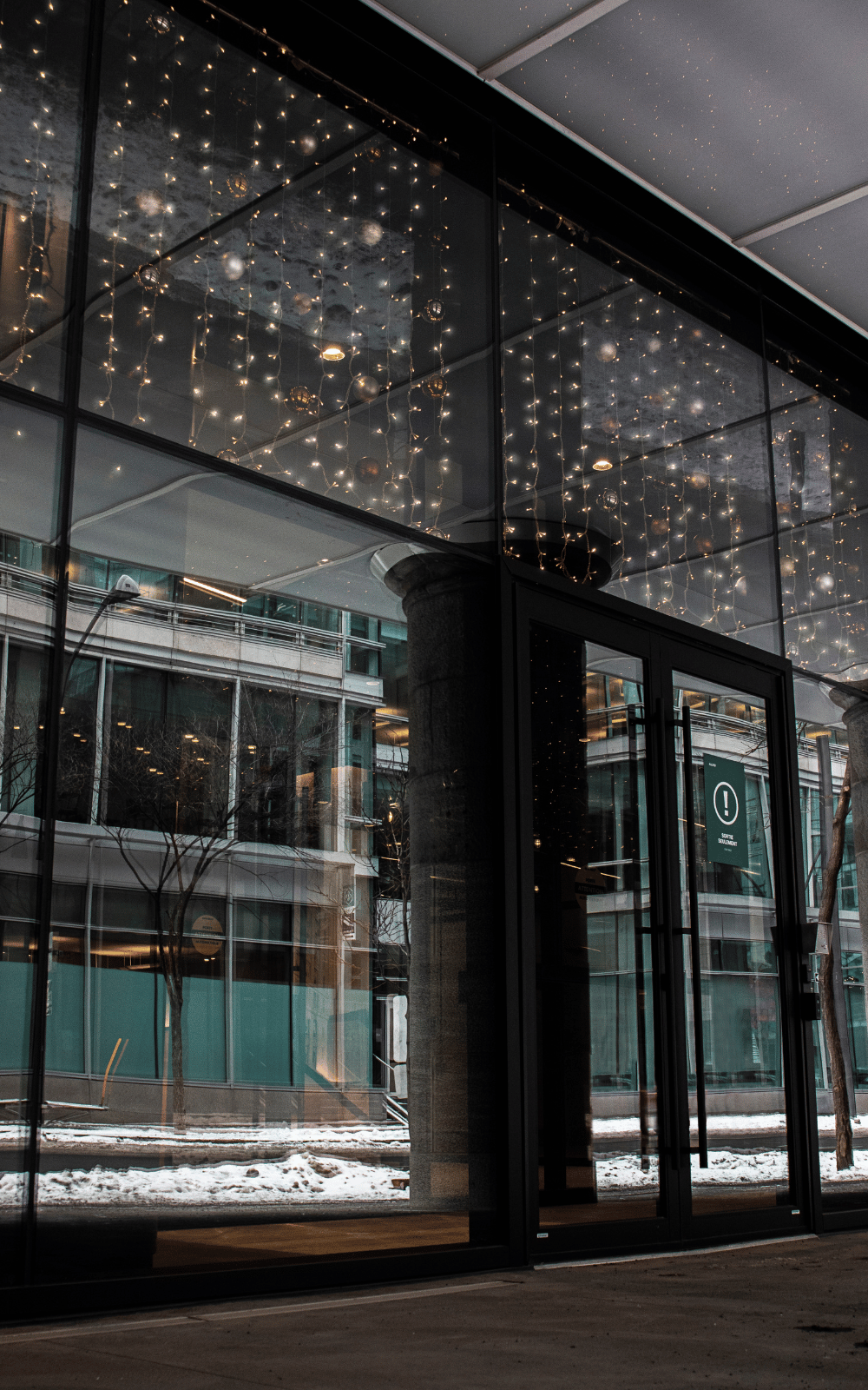 Fabrication de guirlandes de Noël pour orner les colonnes à l’intérieur du Allied REIT à Montréal. Plusieurs retombées de boules et lumières de Noël ont aussi été installées devant les fenêtres de l’entreprise.