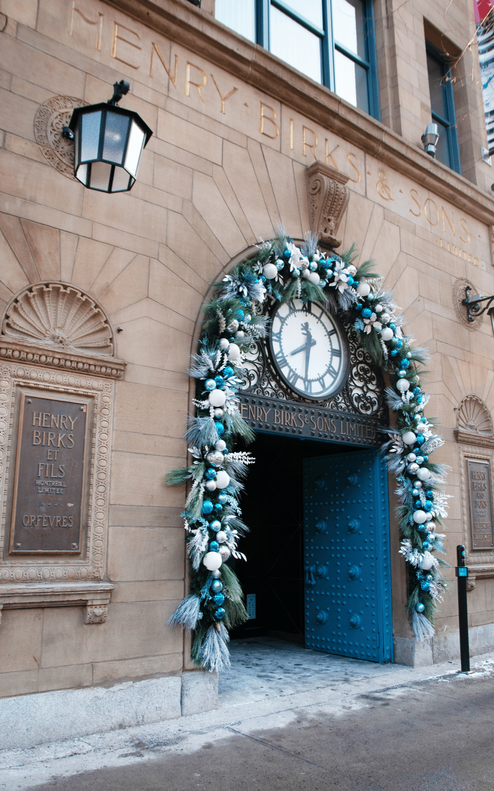 Conception d’une grande guirlande de Noël décorée d’ornements bleus pour la façade du Birks à Montréal. Plusieurs tiges de sapinage blanc ont été insérées pour un résultat des plus magiques.