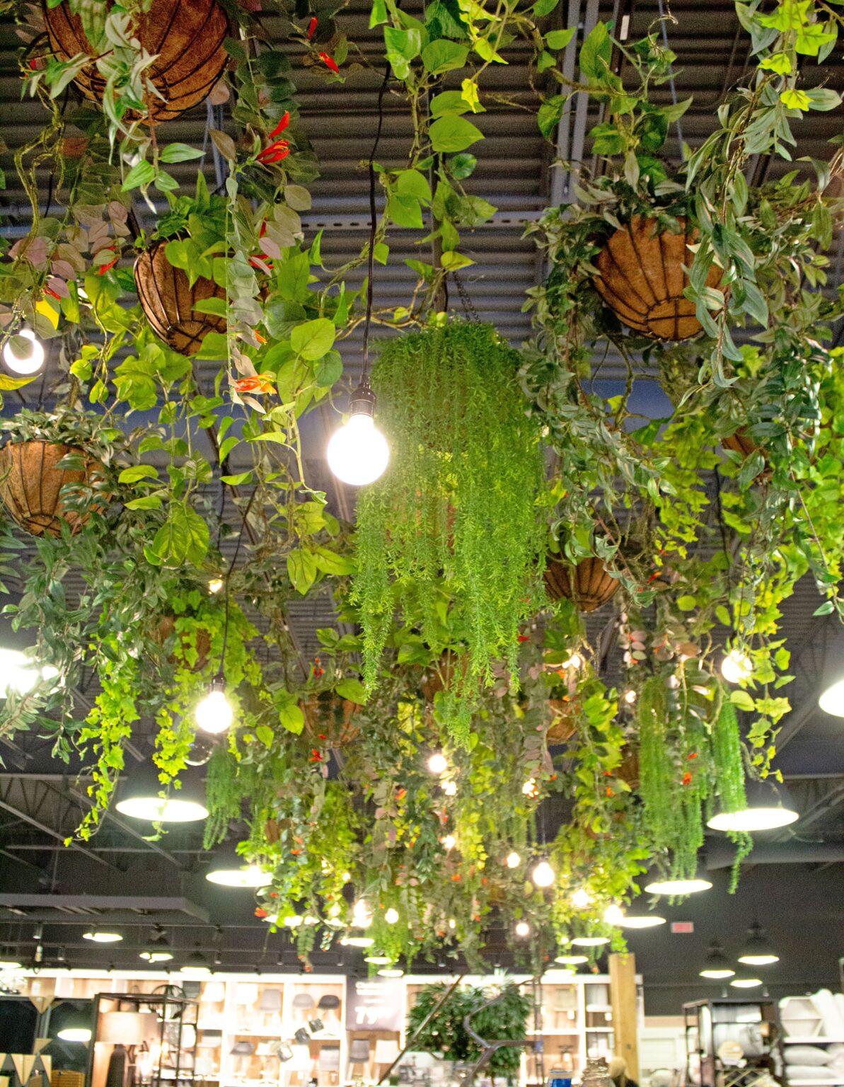 Regroupements de plantes en suspension aux plafonds de deux boutiques d’articles de décoration. Ils sont composés de lierre, de fougère et de pothos retombant.