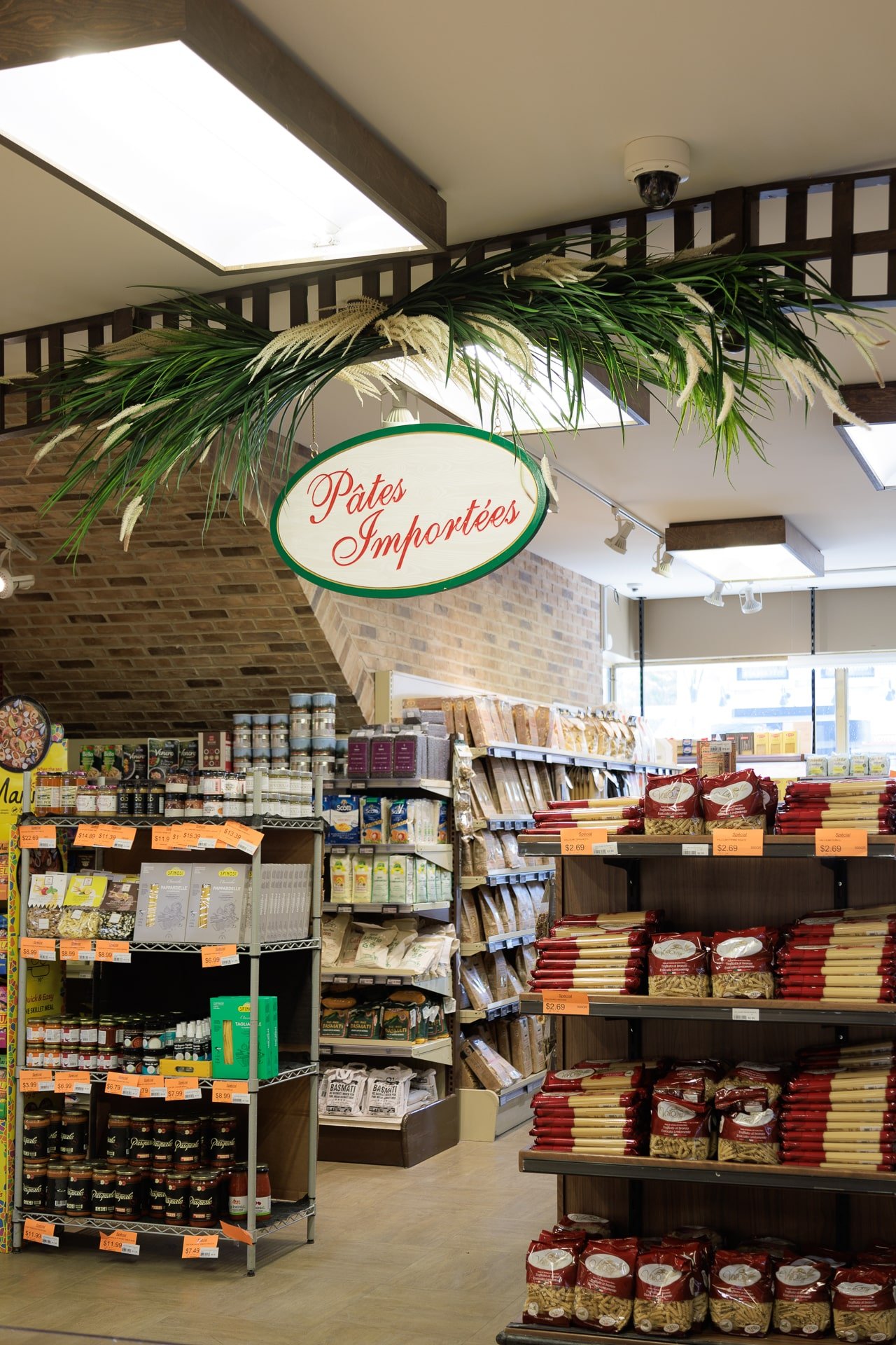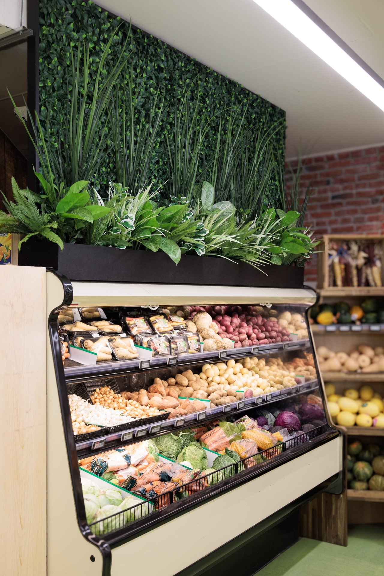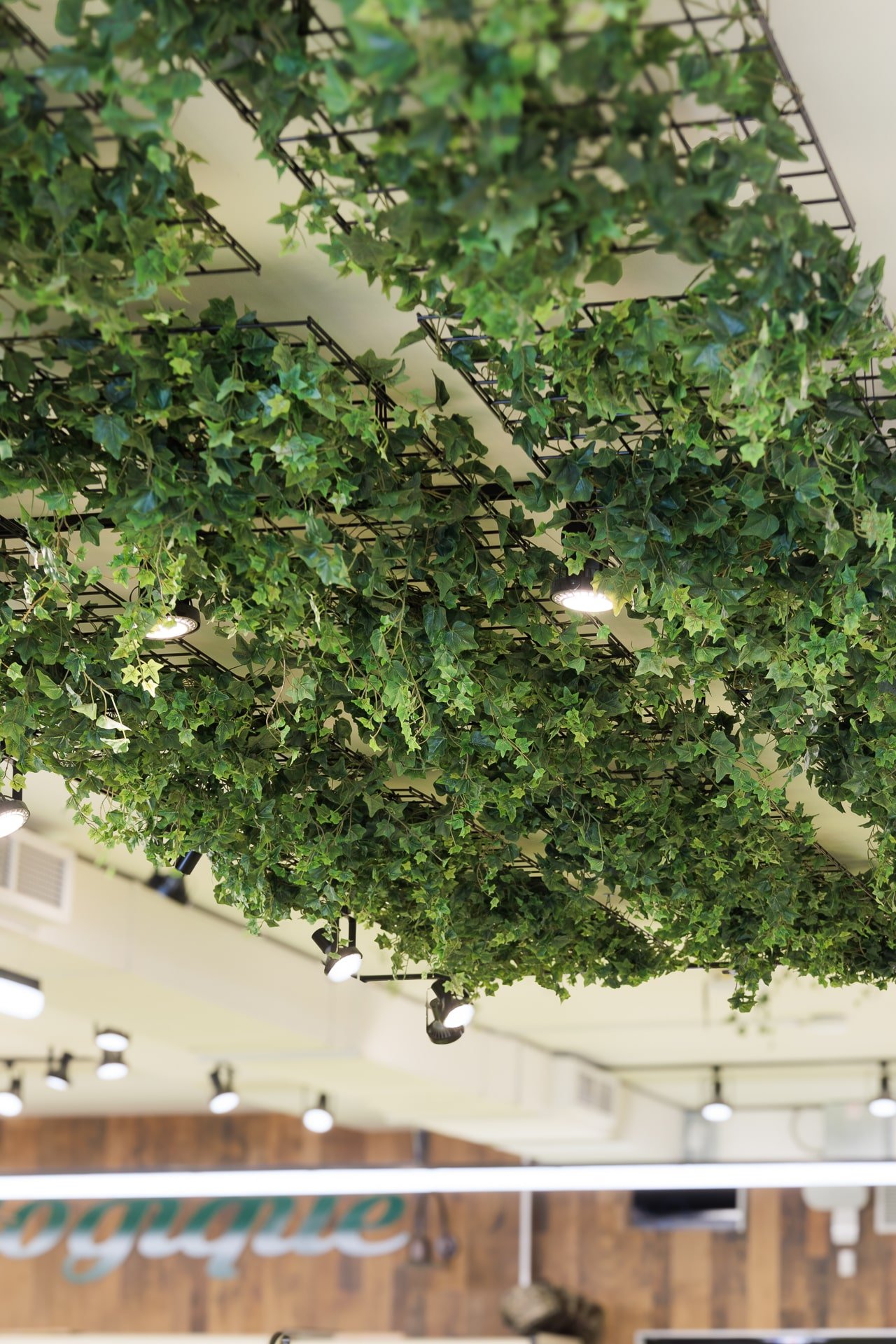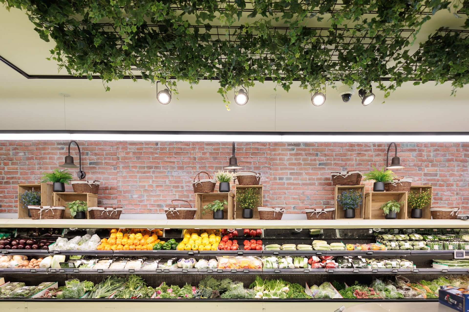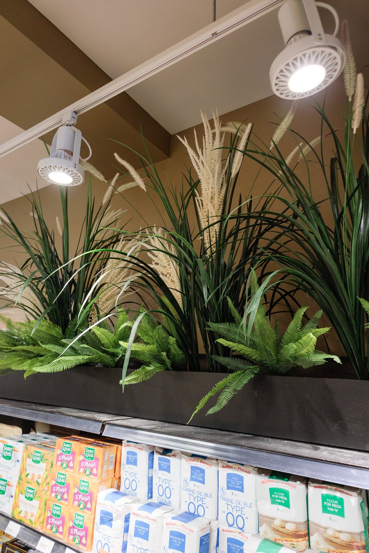 Lorsqu’il s’agit d’une épicerie, il peut être plus difficile de trouver de l’inspiration pour une décoration invitante. C’est pourquoi, l’épicerie Milano a fait affaire avec notre service de design commercial. L’équipe de design a réalisé un décor chaleureux grâce à l’ajout de verdure retombante au plafond et à l’intégration de plantes dans le haut des étagères.
