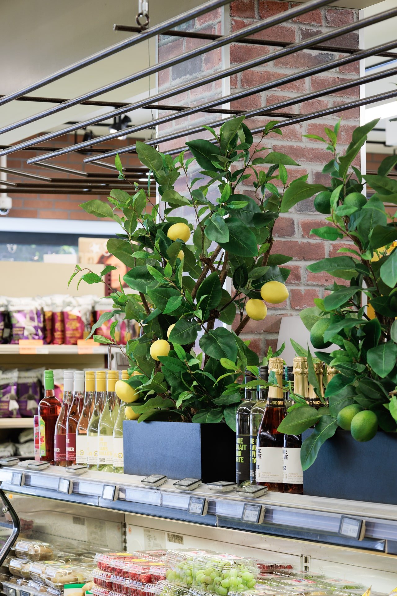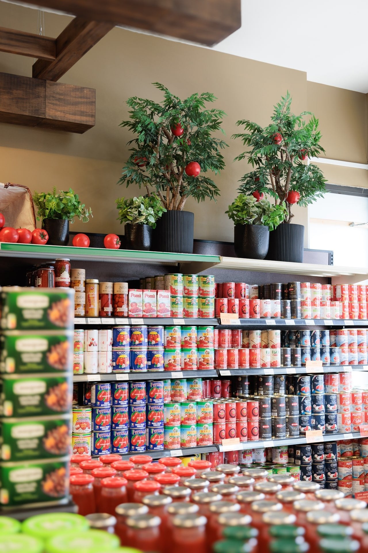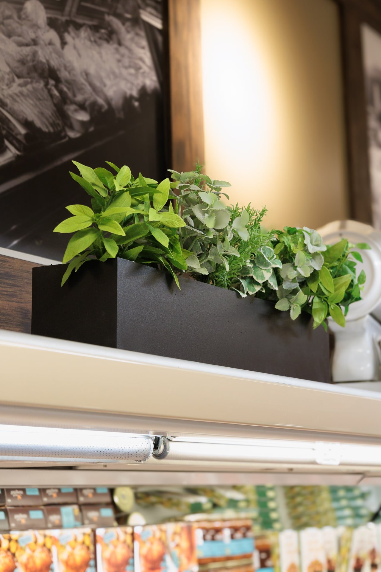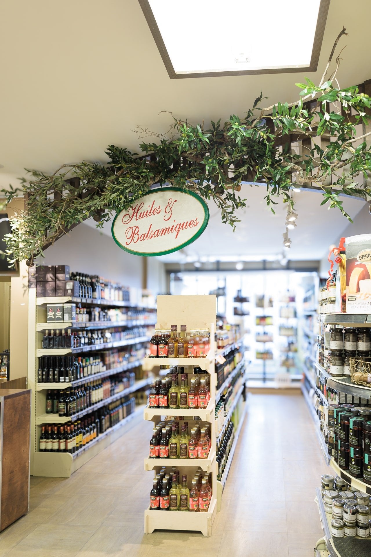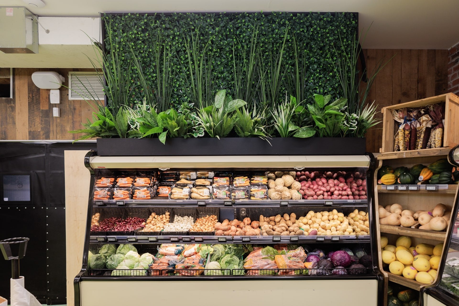 Lorsqu’il s’agit d’une épicerie, il peut être plus difficile de trouver de l’inspiration pour une décoration invitante. C’est pourquoi, l’épicerie Milano a fait affaire avec notre service de design commercial. L’équipe de design a réalisé un décor chaleureux grâce à l’ajout de verdure retombante au plafond et à l’intégration de plantes dans le haut des étagères.