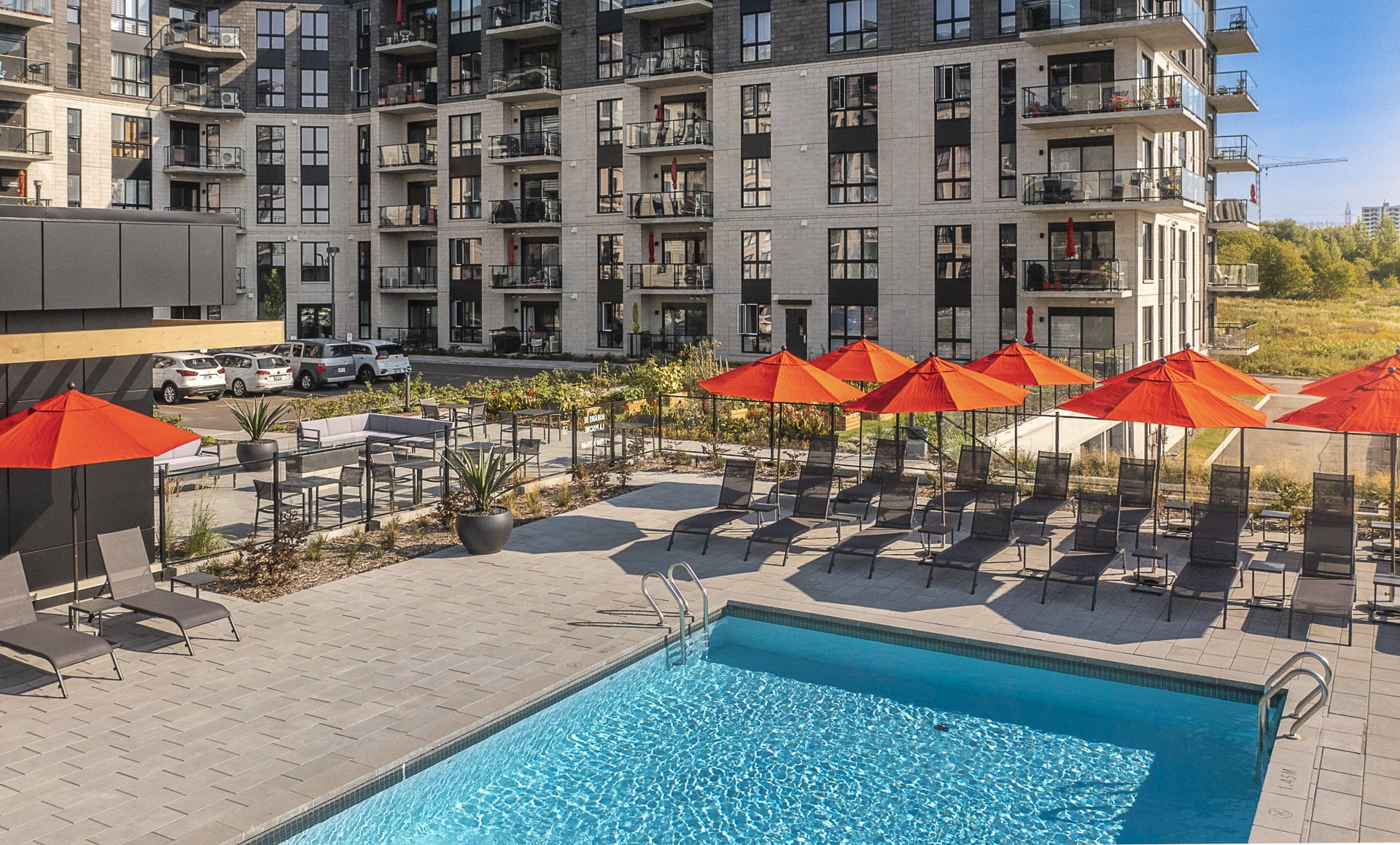 Beau projet de mobilier urbain pour le complexe immobilier Quartier Louis 14, du groupe Damco. Un ensemble de parasols, chaises longues, table et sectionnels a été ajouter à leur air commune ainsi que de grandes agaves americana