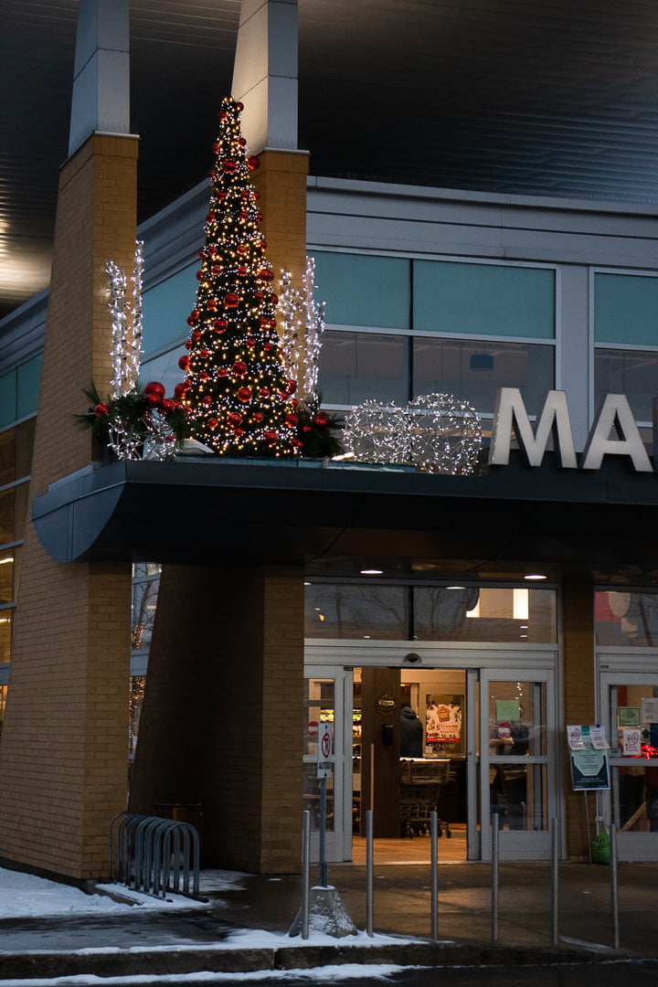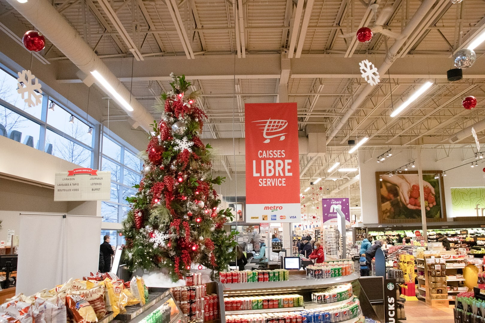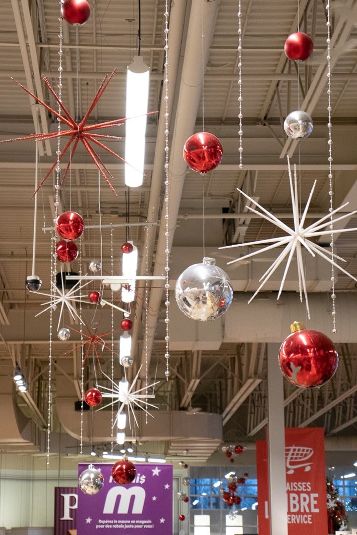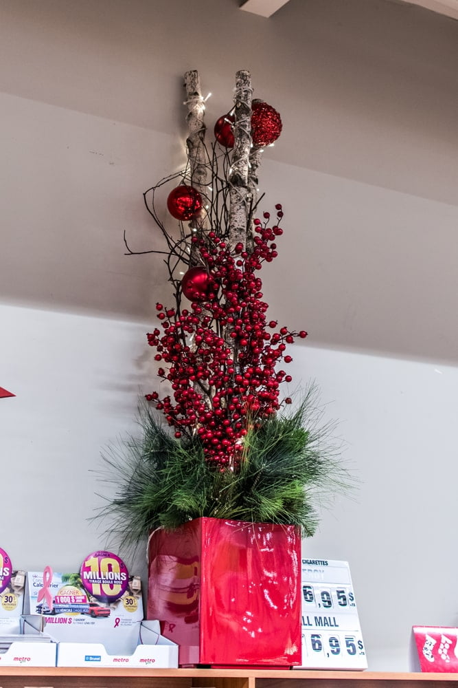Installation et décoration d’un grand sapin de Noël à l’entrée du Métro Dépatie à Laval. Des ornements de Noël variés ont été utilisés dans les tons de rouge: cocottes, flocons de neige, poinsettias, baies et plus encore. Plusieurs autres décorations ont été réalisées à l’extérieur et à l’intérieur de l’épicerie.