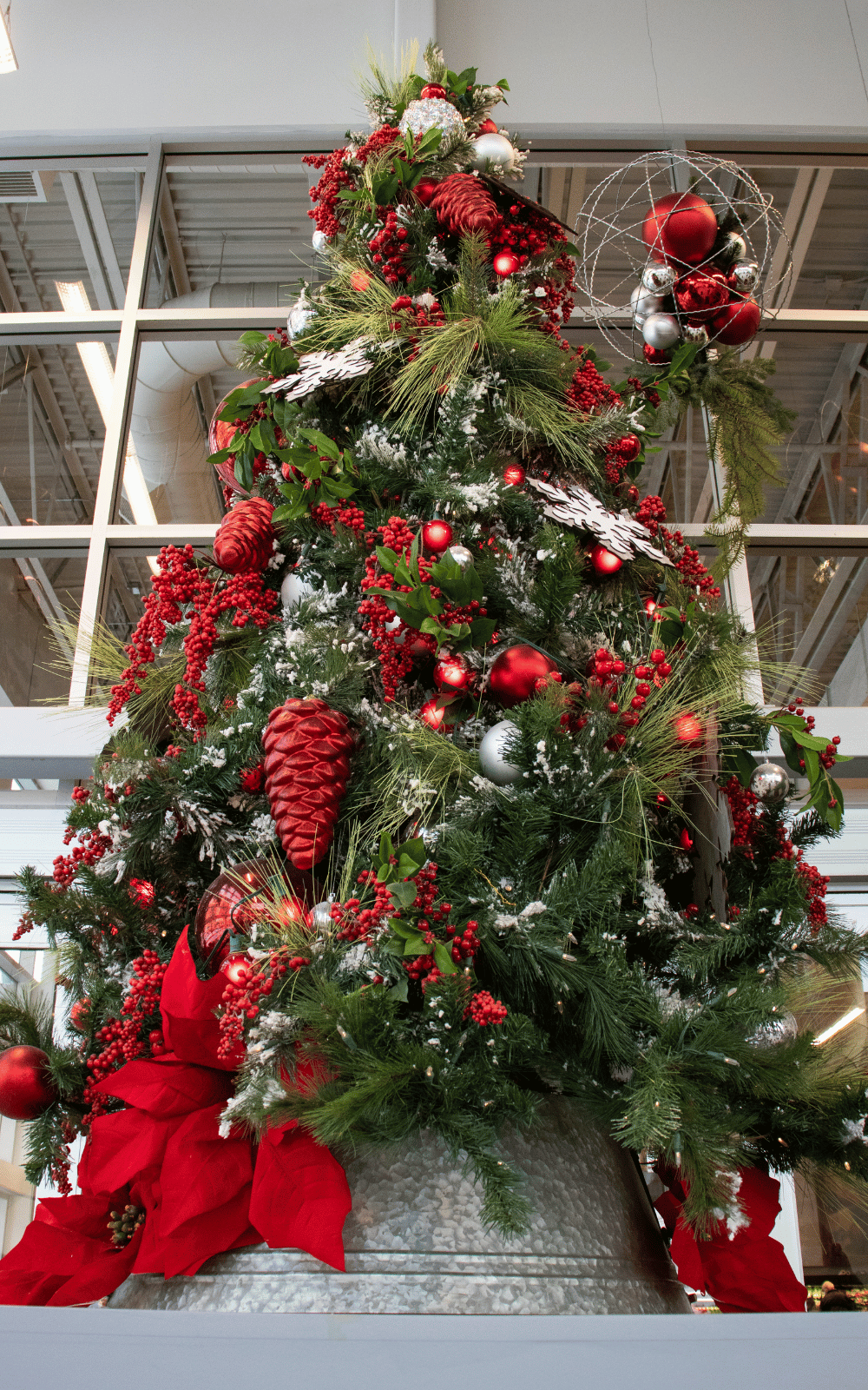 Grand sapin de Noël rouge avec flocons - Décors Véronneau