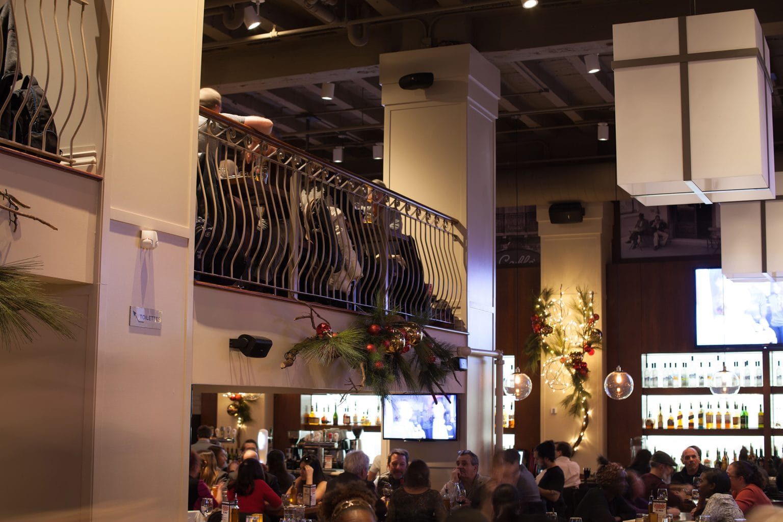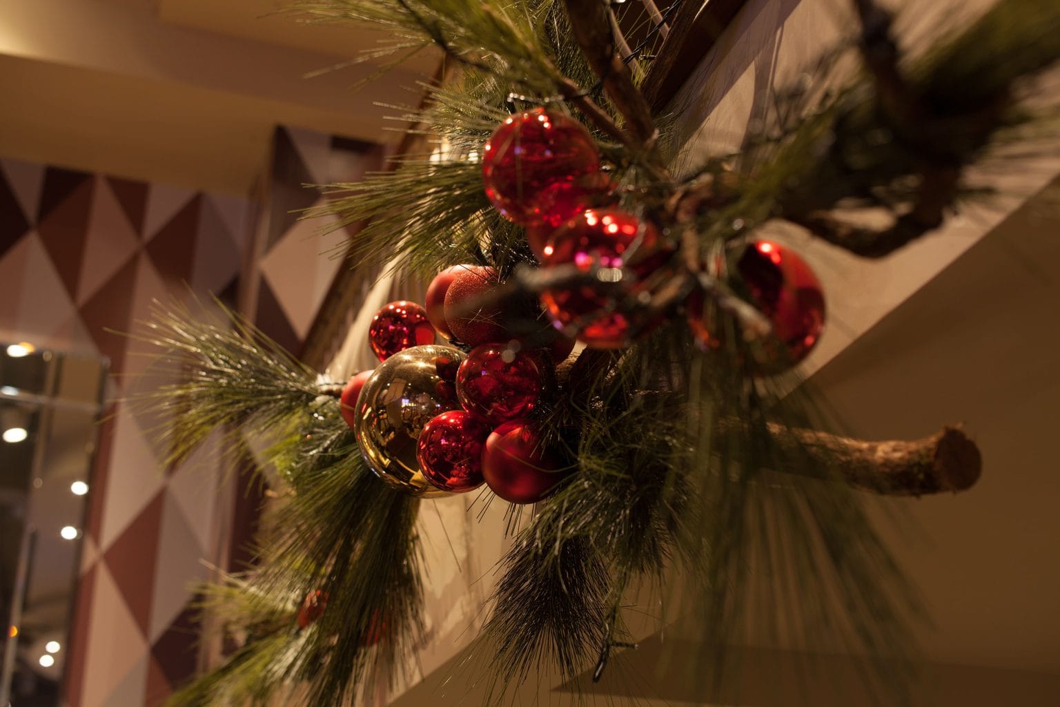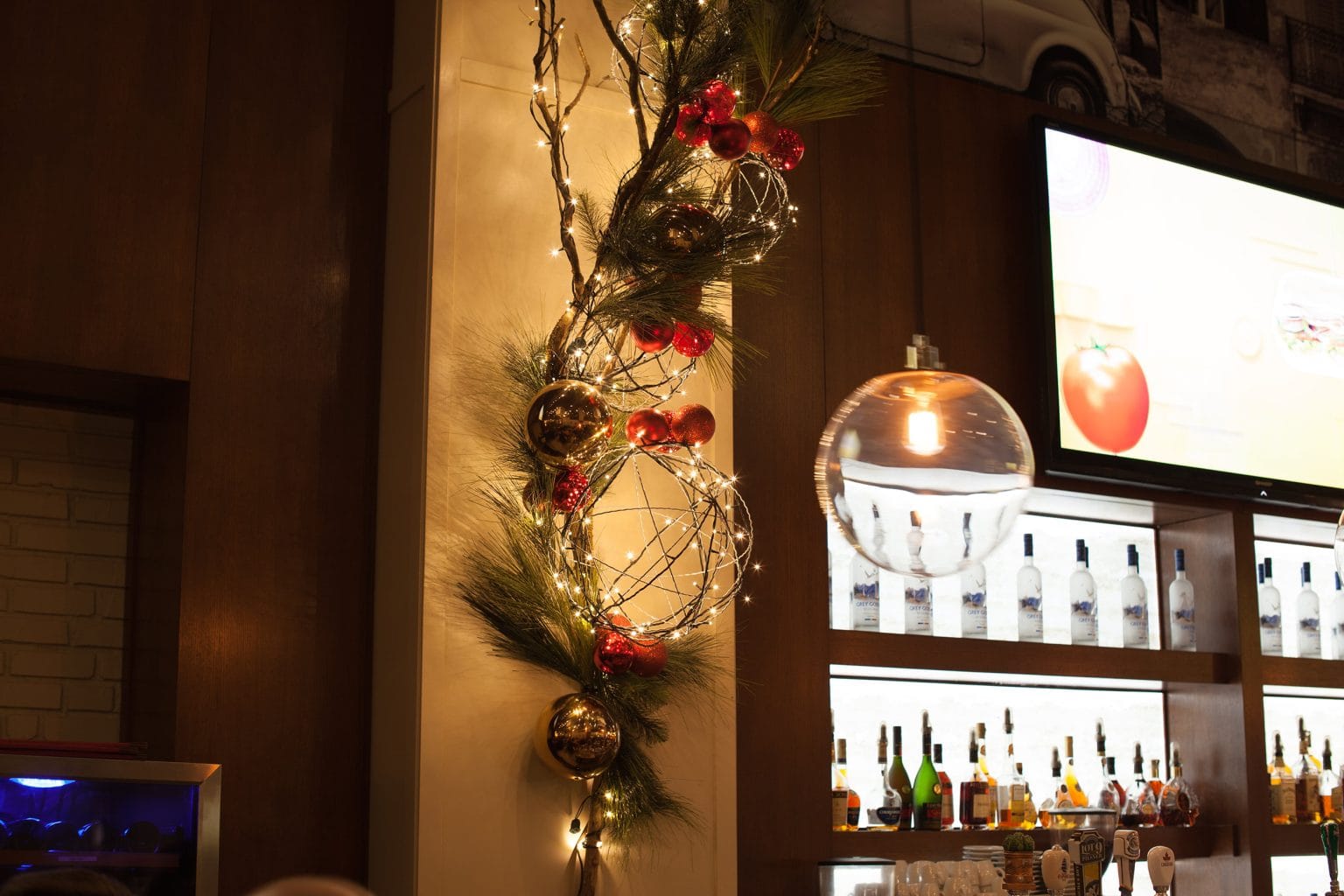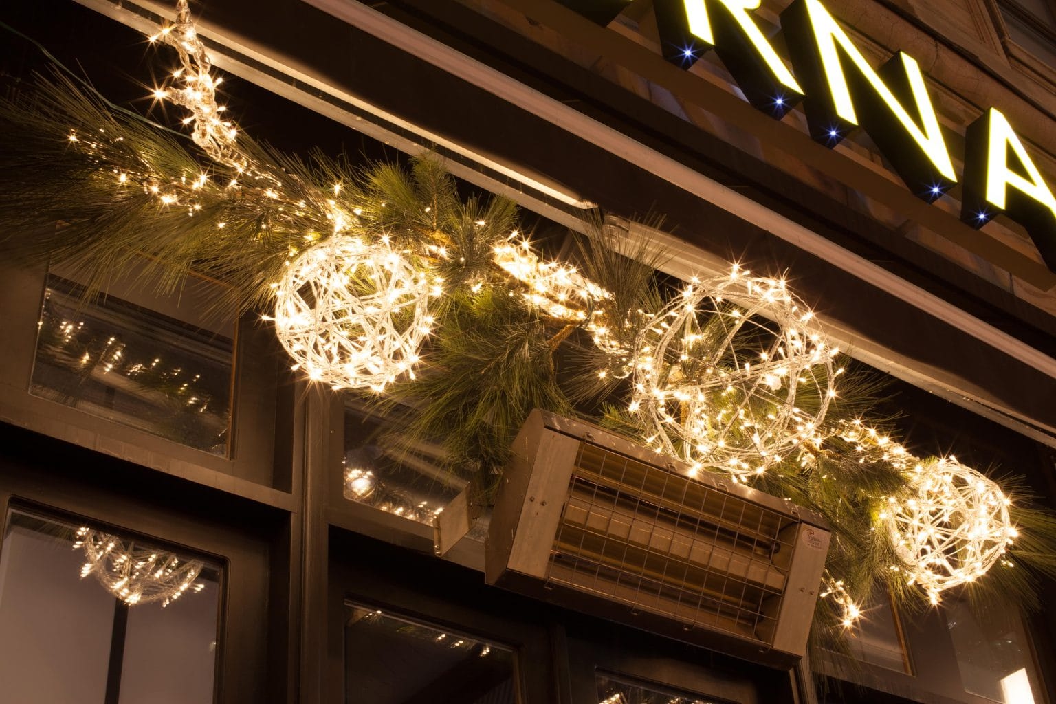 Créations sur mesure pour l’extérieur et l’inférieur de ce restaurant situé à Montréal. Le décor extérieur est composé de sphères, de sapinage et de branches de bois illuminés. installés dans le haut de la devanture. Pour l’intérieur, des créations sur mesure composées d’éléments similaires aux décors extérieur sont installées à plusieurs endroits dans le restaurant, ajoutant une luminosité et une ambiance festive au restaurant.