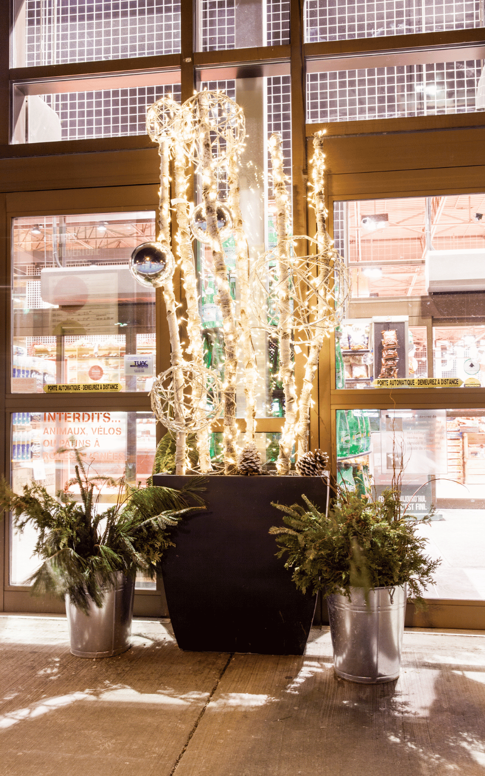 Installation de lumières de Noël couleur blanc chaud et de sphères en métal illuminées pour le Provigo de Montréal. Un grand arrangement lumineux a aussi été créé pour décorer la porte d’entrée de ce supermarché.