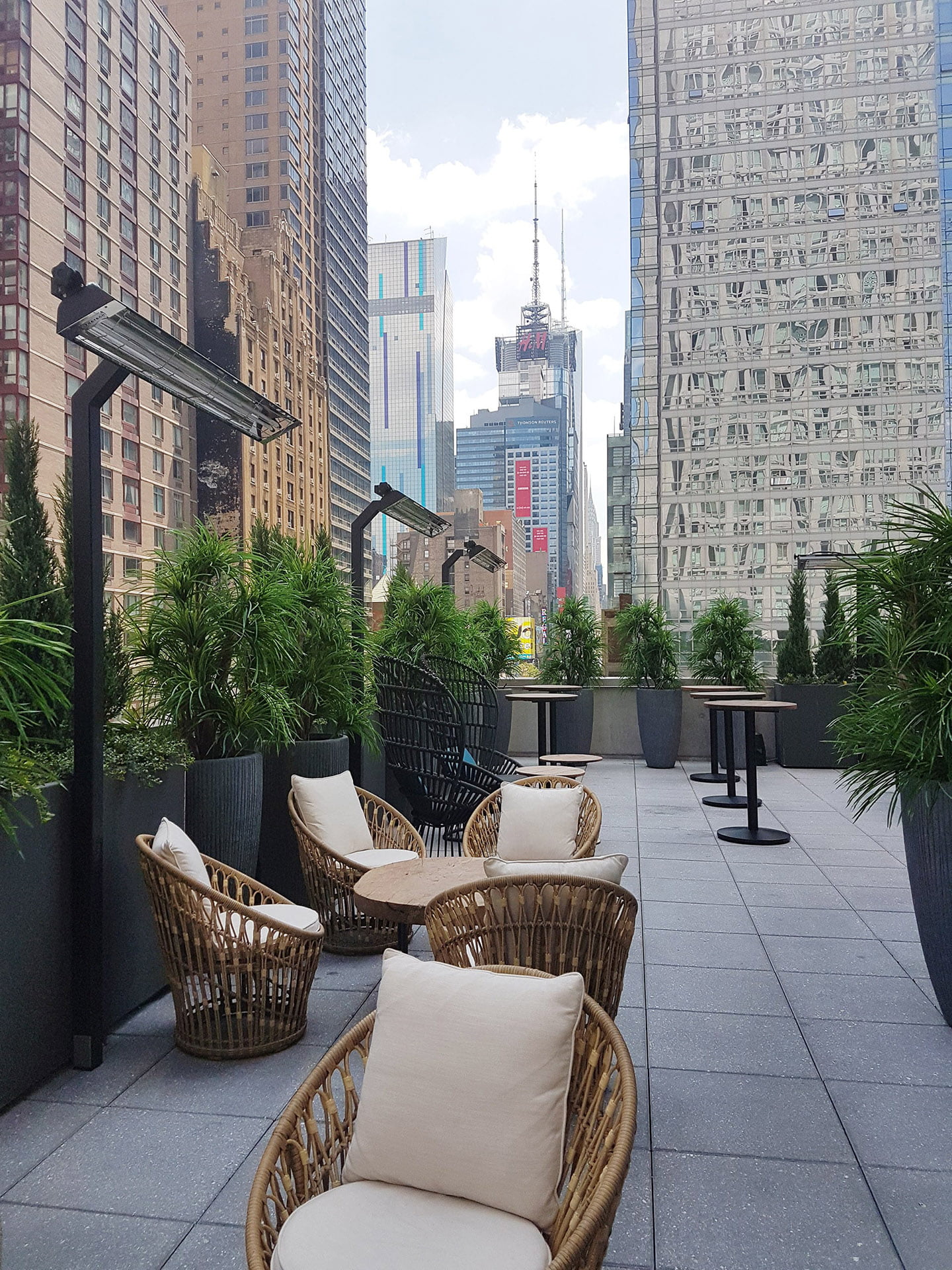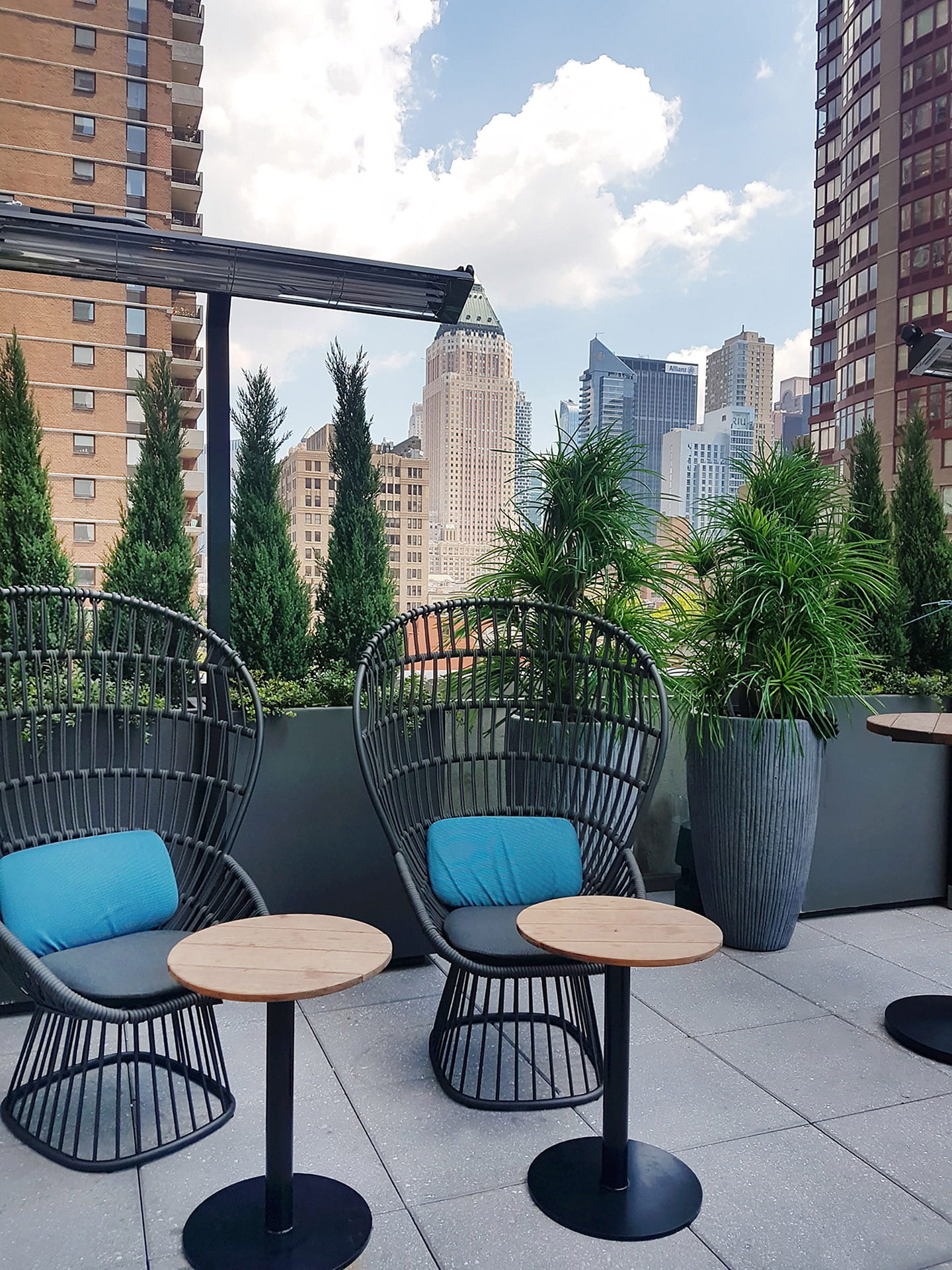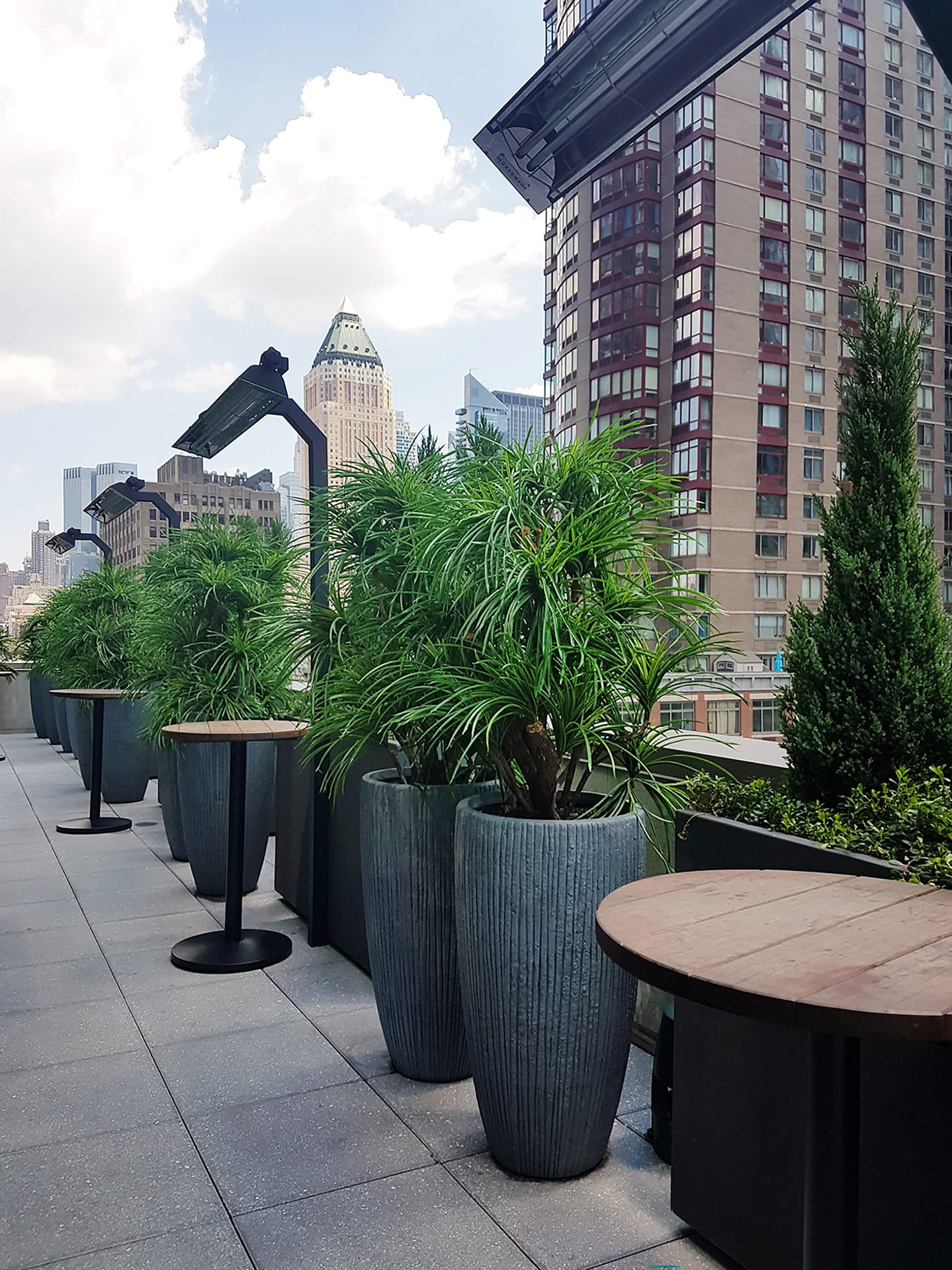 Aménagement de cette terrasse située à New York, aux États-Unis. Création d’arbres fabriqués par nos experts en atelier de type Raintree dans des pots de fibre d’argile noir, ainsi que des cèdres dans des bacs rectangulaires ajoutant plus d’intimité et créant une division visuelle pour cet espace.